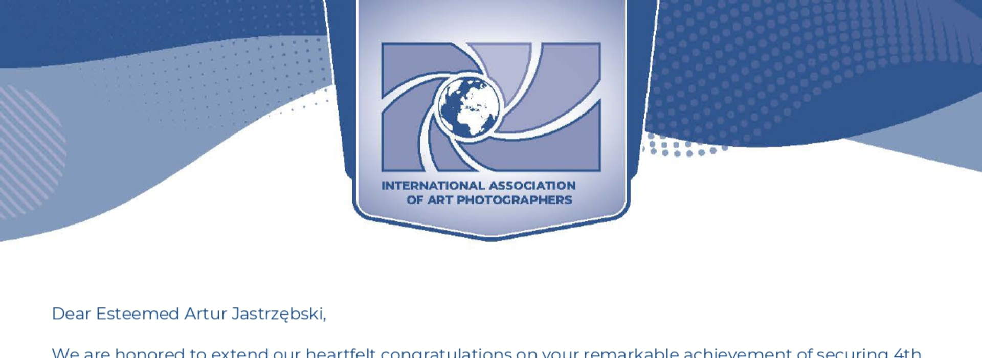 Prezydium Międzynarodowego Stowarzyszenia Artystów Fotografów (IAAP) przyznało mi 4. miejsce w krajowym rankingu za rok 2025 dołączając jednocześnie wyrazy uznania.
