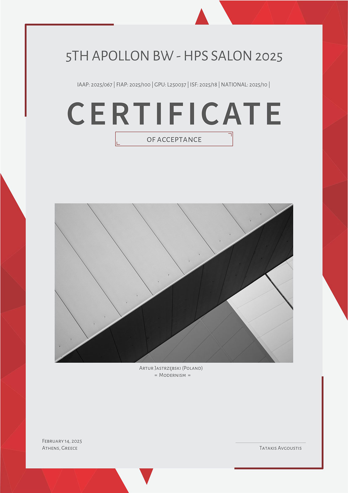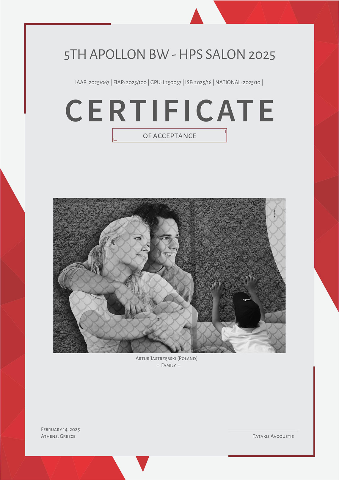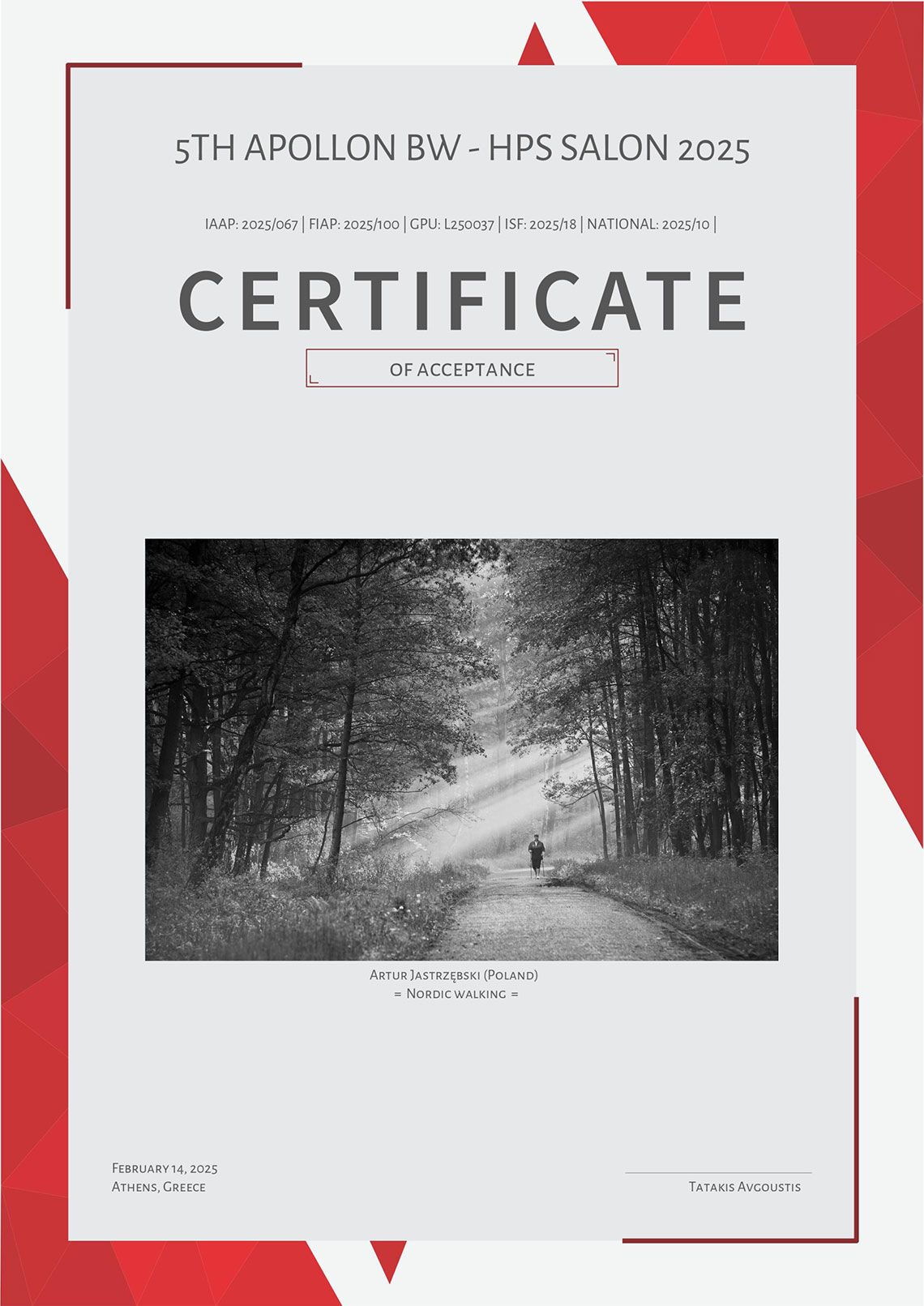 Zdjęcia „Modernizm”, „Nordic walking” i „Rodzina” otrzymały „akceptację” w międzynarodowym konkursie fotograficznym 5th APOLLON BW – HPS SALON 2025 organizowanym przez grecki Hellenic Photographic Society.