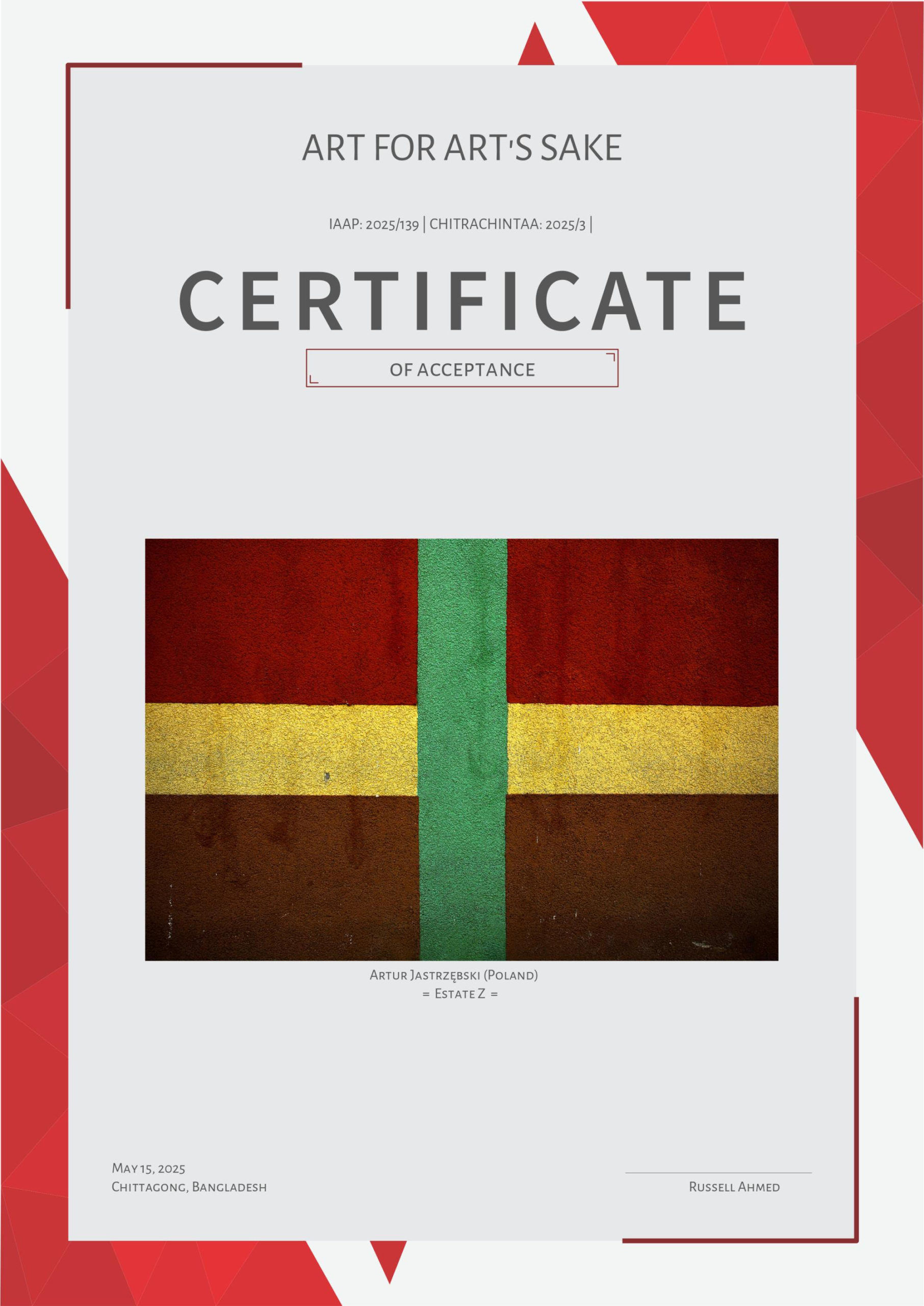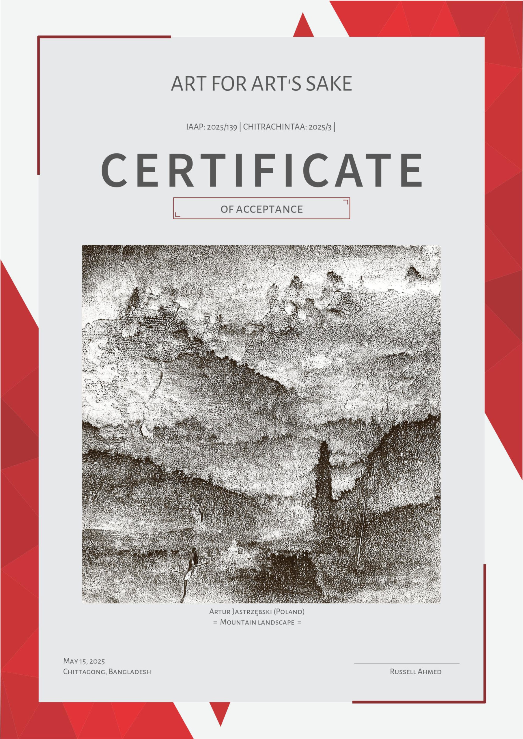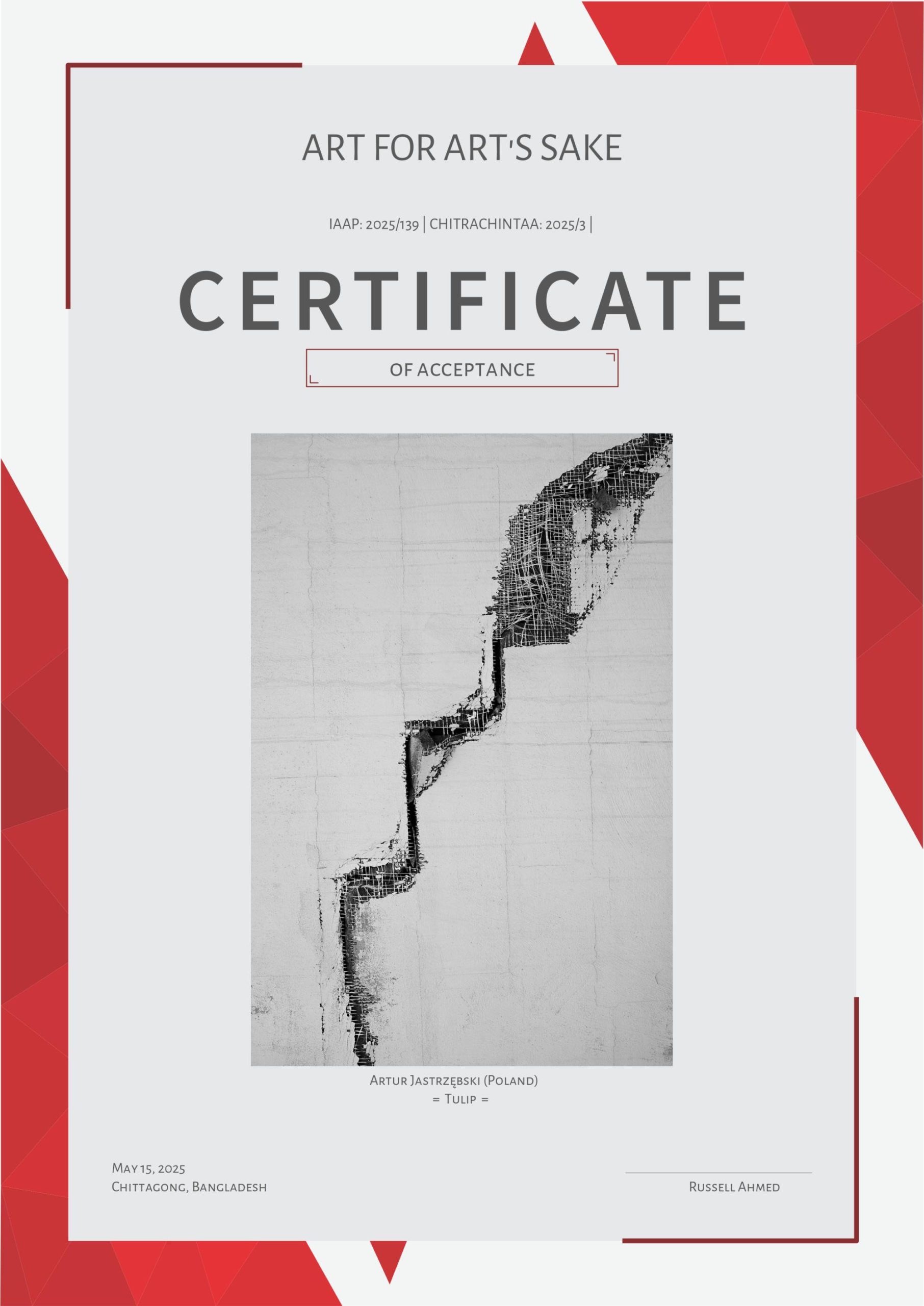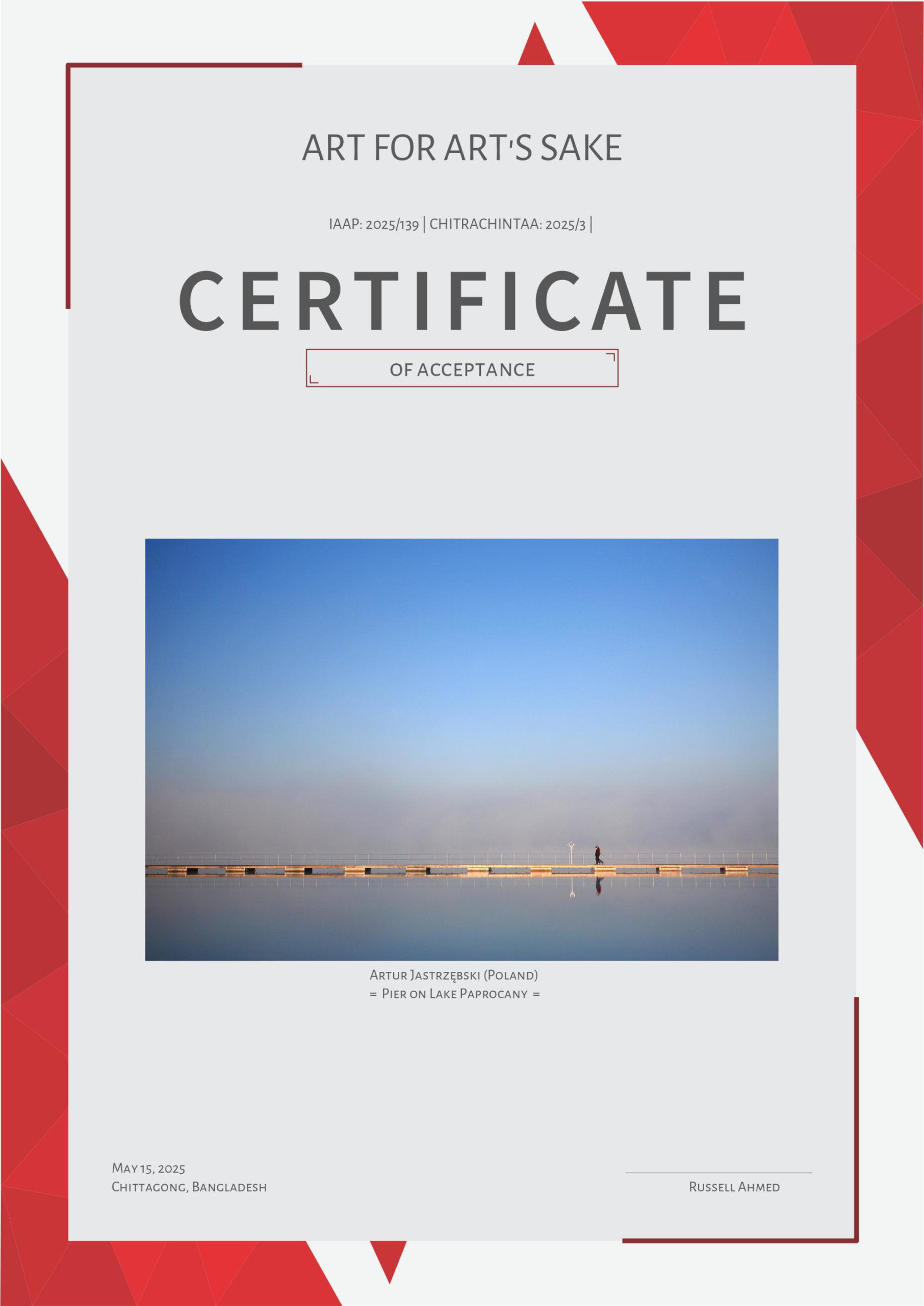Zdjęcia z cyklu „Impresje paprocańskie”, „Osiedle Z”, „Pejzaż górski” i „Wielka woda w Paprocanach” oraz „Pomost na Jeziorze Paprocańskim” i „Tulipan” otrzymały „akceptacje” w międzynarodowym konkursie fotograficznym ART FOR ART’S SAKE organizowanym przez bangladeski CHITRACHINTAA PHOTOGRAPHERS CIRCLE.