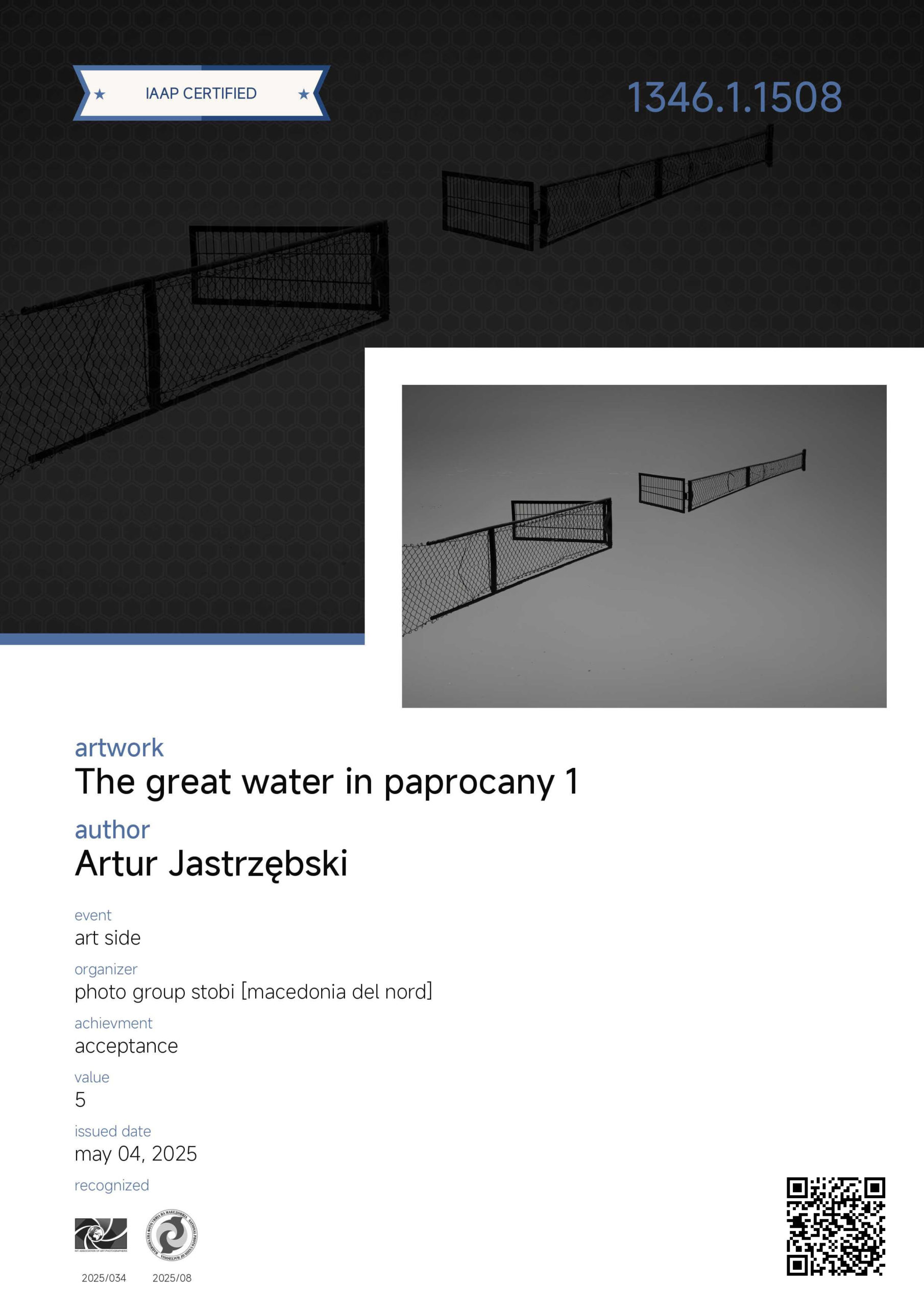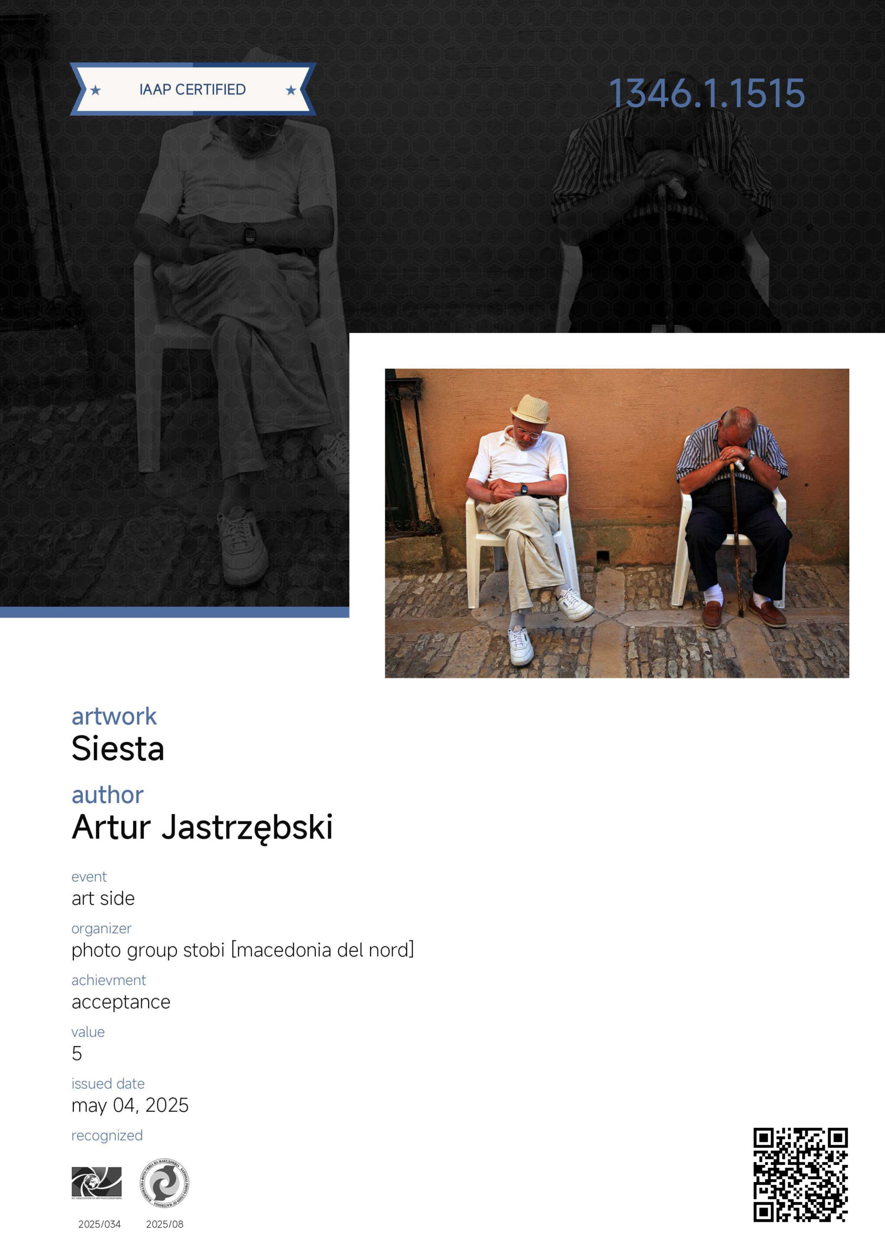 Zdjęcia z cyklu „Sycylijczycy” („Sjesta”) i „Wielka woda w Paprocanach” oraz „Osika” i „Pomost na Jeziorze Paprocańskim” otrzymały „akceptacje” w międzynarodowym konkursie fotograficznym Art Side organizowanym przez północnomacedoński Photo group Stobi.