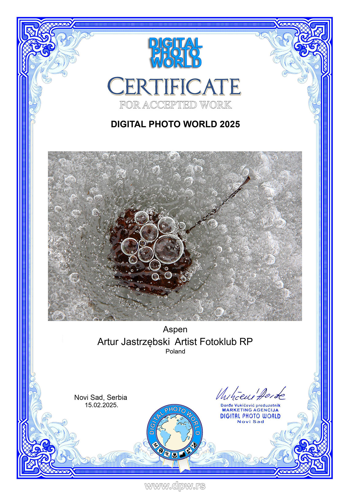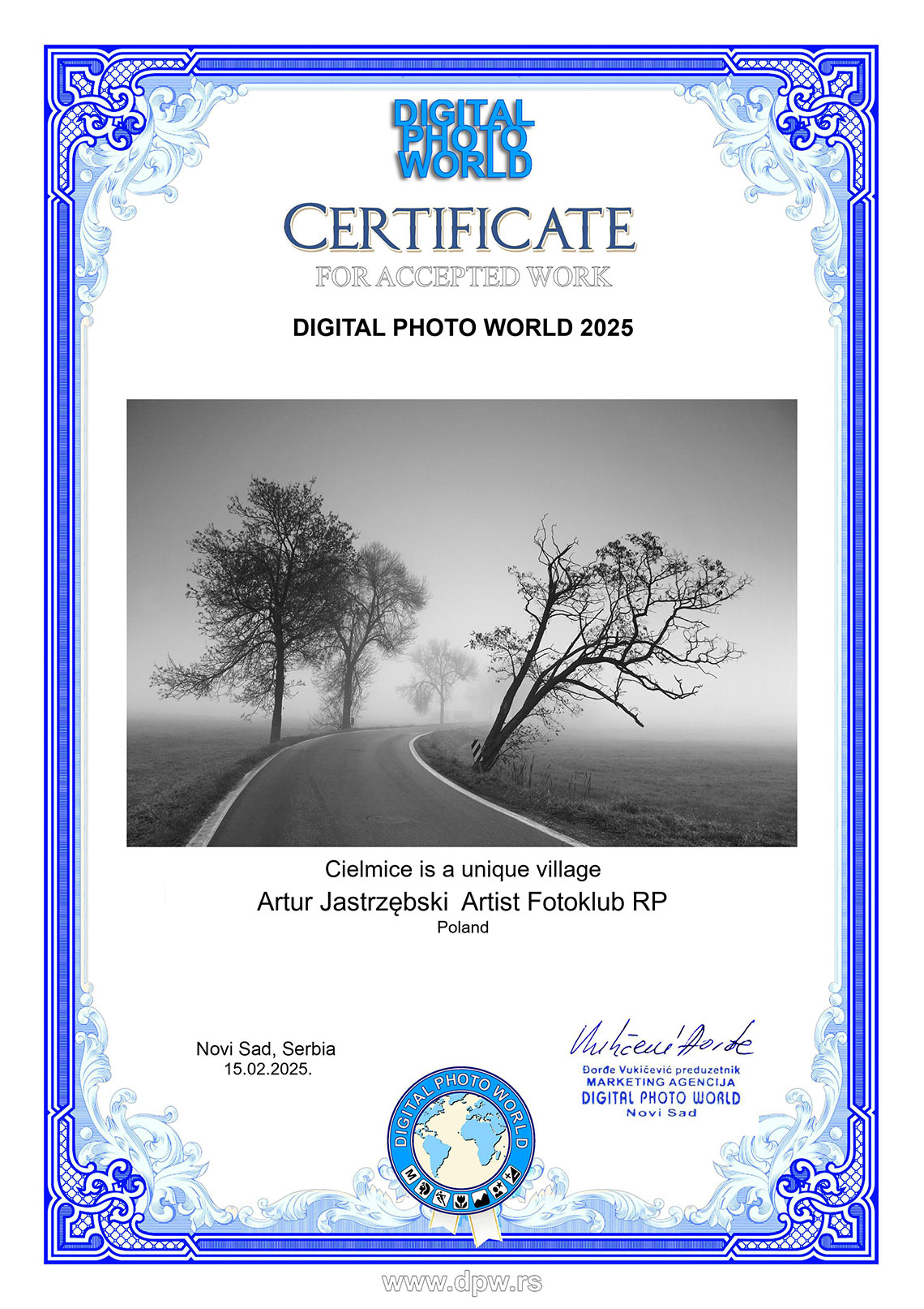 Zdjęcie z cyklu „Cielmice wieś wyjątkowa” i „Osika” otrzymały „akceptację” w międzynarodowym konkursie fotograficznym „DIGITAL PHOTO WORLD 2025” organizowanym przez serbski Digital Photo World.