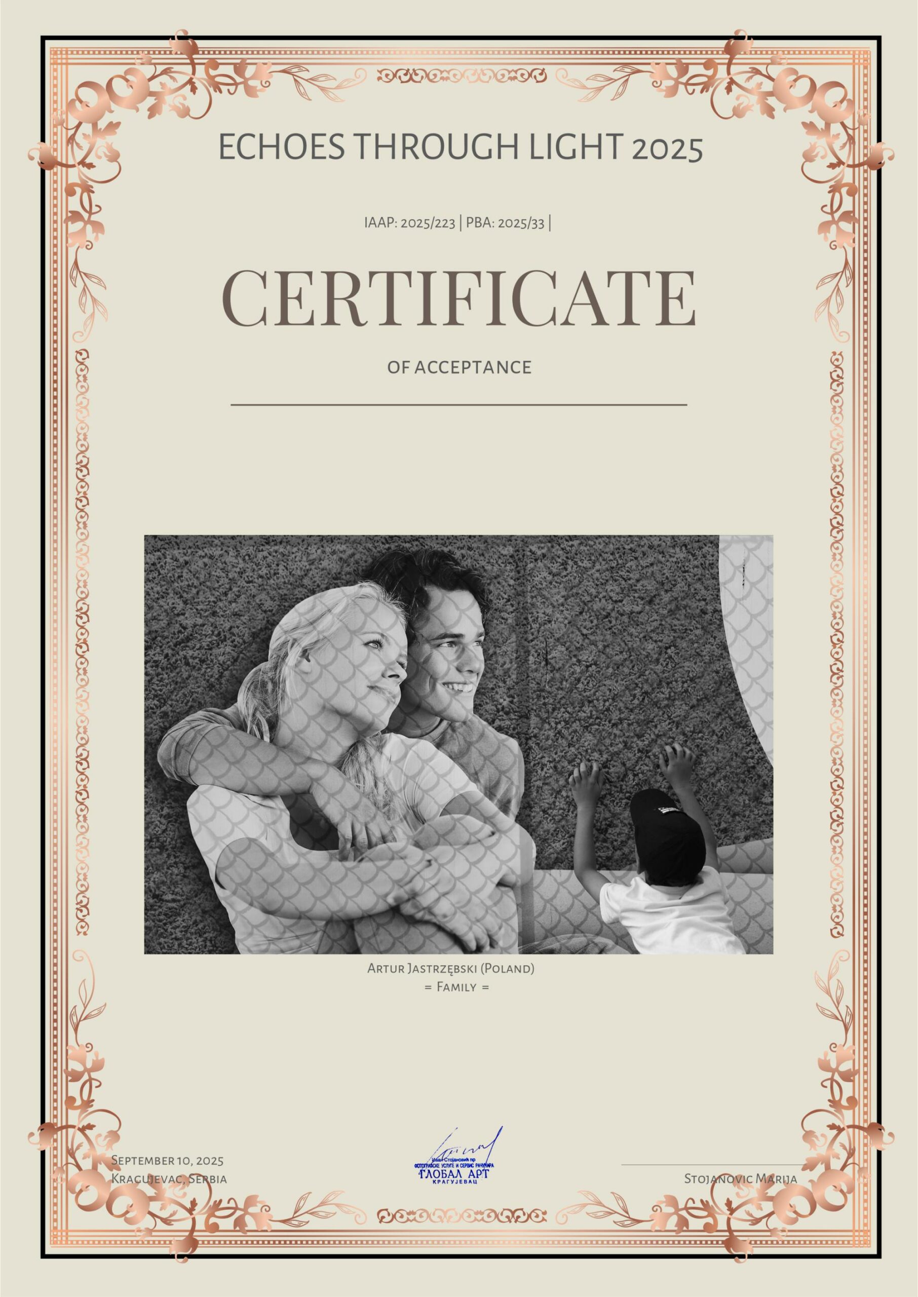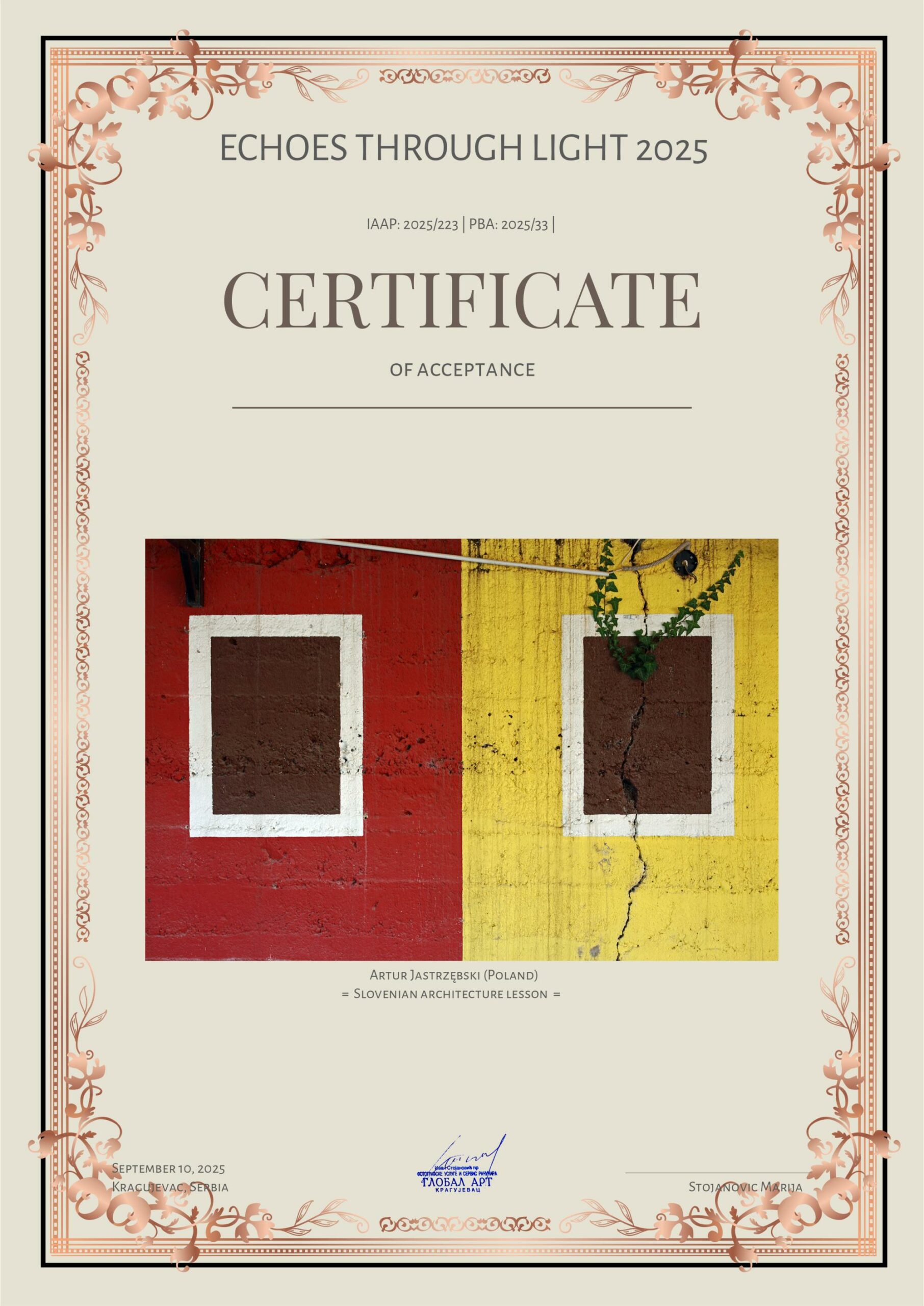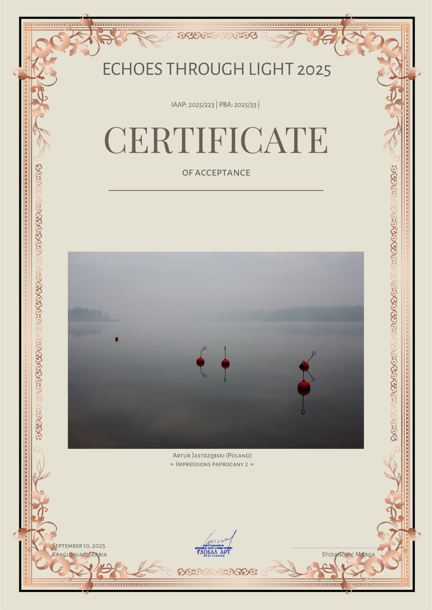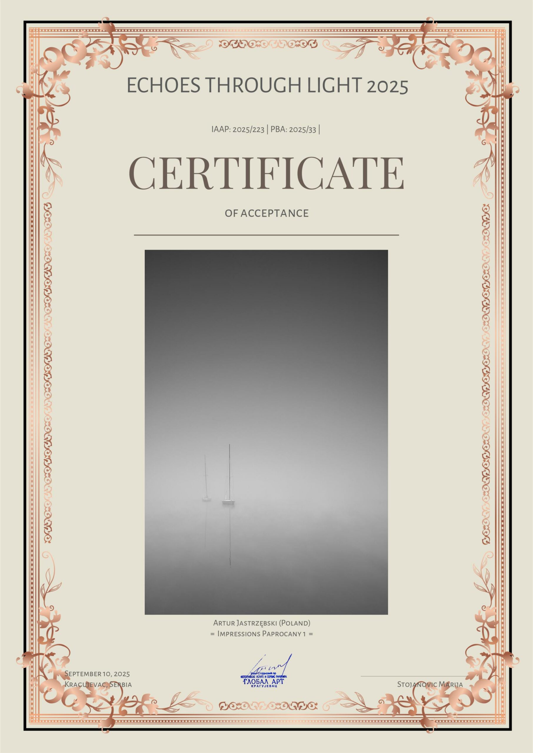Zdjęcia z cyklu „Impresje paprocańskie” i „Słoweńska lekcja architektury” oraz „Pomost na Jeziorze Paprocańskim” i „Rodzina” otrzymały „akceptacje” w międzynarodowym konkursie fotograficznym Echoes Through Light 2025 organizowanym przez serbski Global Art.