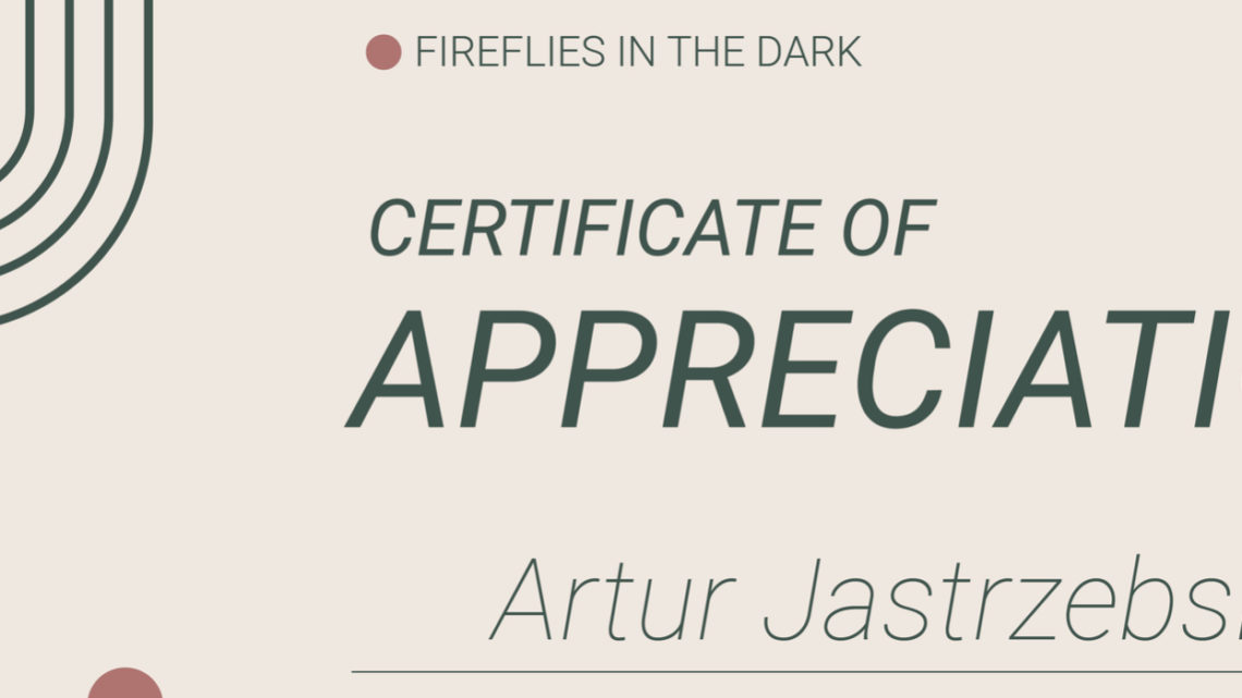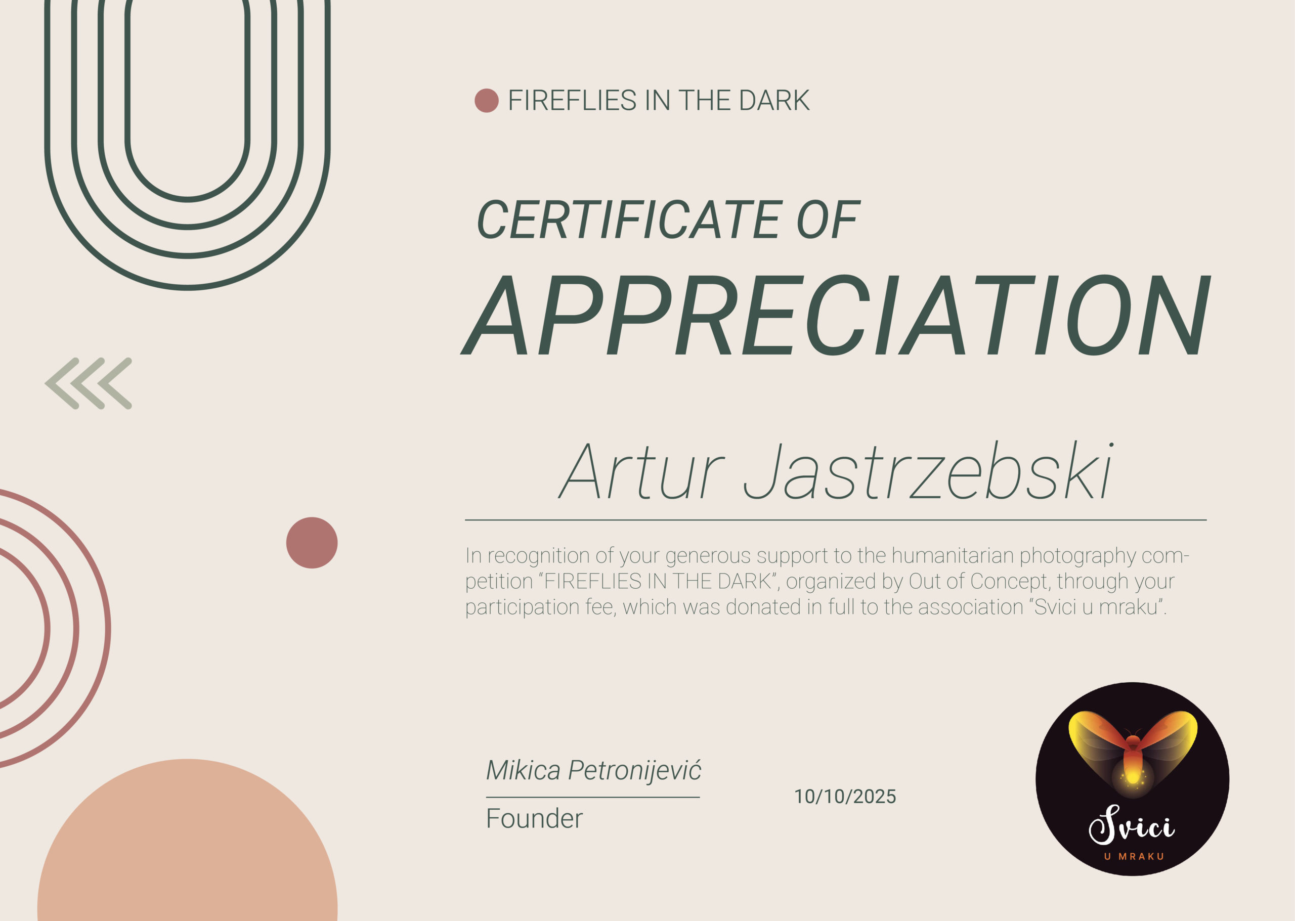 Podziękowania od Jovana Svorcana (Out Of Concept) za udział w humanitarnym konkursie fotograficznym FIREFLIES IN THE DARK. Opłata w całości została przekazana serbskiemu stowarzyszeniu „Svici u mraku”, które wspiera działania na rzecz dzieci i osób z autyzmem.