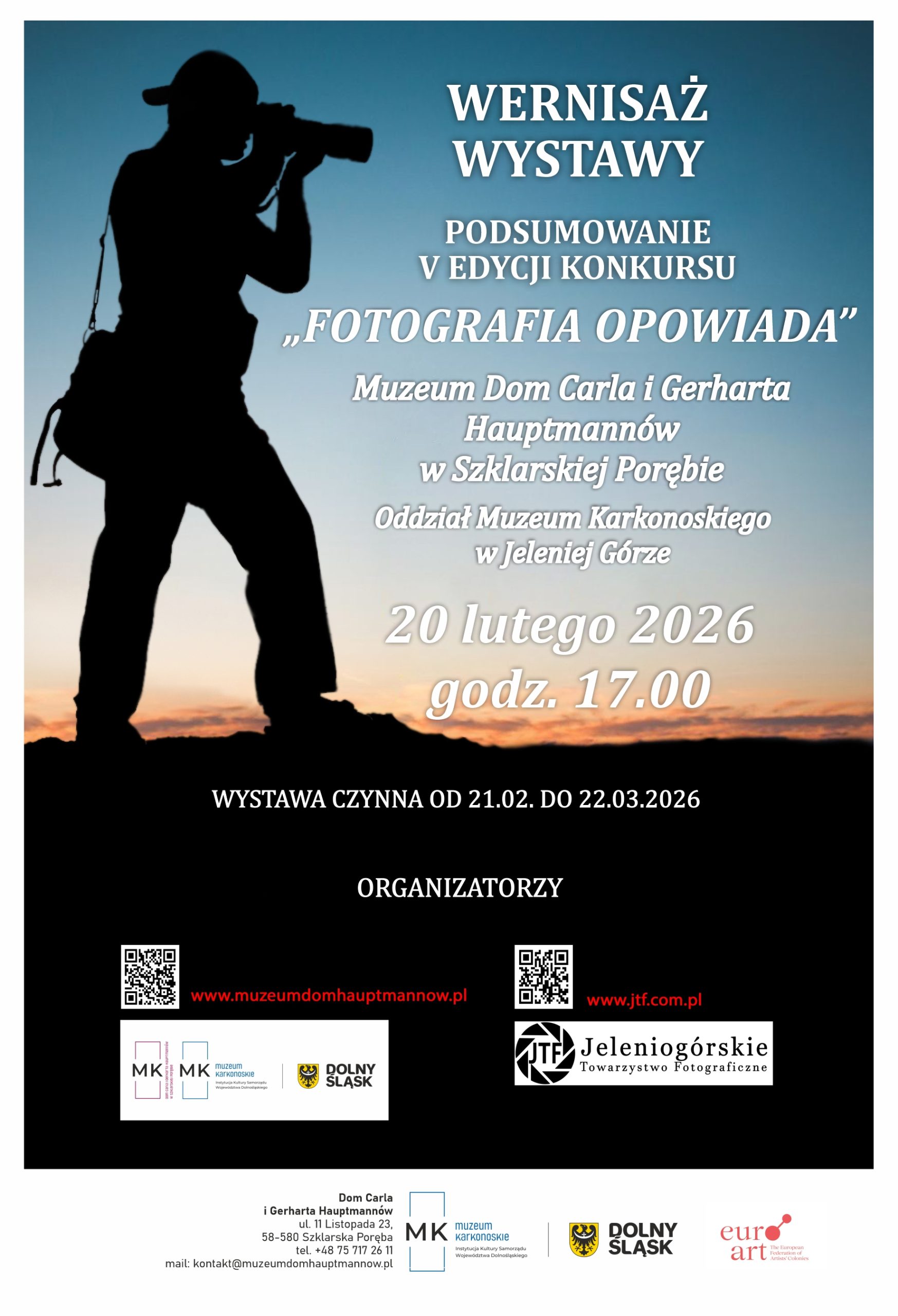 Zapraszam na wernisaż wystawy pokonkursowej Fotografia opowiada na którym m.in. będzie można zobaczyć trzy moje zdjęcia: „Impresje paprocańskie”, „Bez tytułu”, „Hot n’ Sweet”. Wernisaż odbędzie się 20 lutego o godz. 17:00 w Domu Carla i Gerharta Hauptmannów (Oddział Muzeum Karkonoskiego w Jeleniej Górze) w Szklarskiej Porębie. Ekspozycja prezentowana będzie do 22 marca 2026 roku.