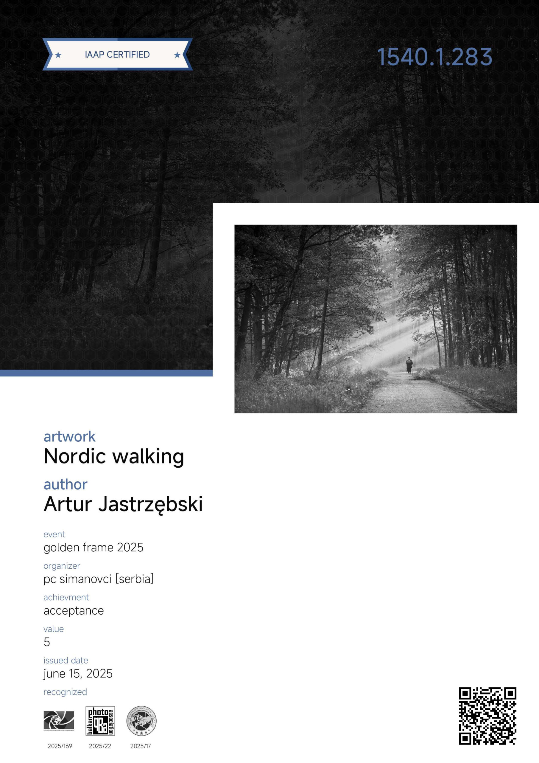 Zdjęcia „Kobieta z chustą” i „Nordic walking” otrzymały „akceptacje” w międzynarodowym konkursie fotograficznym Golden Frame 2025 organizowanym przez serbski PC Simanovci.