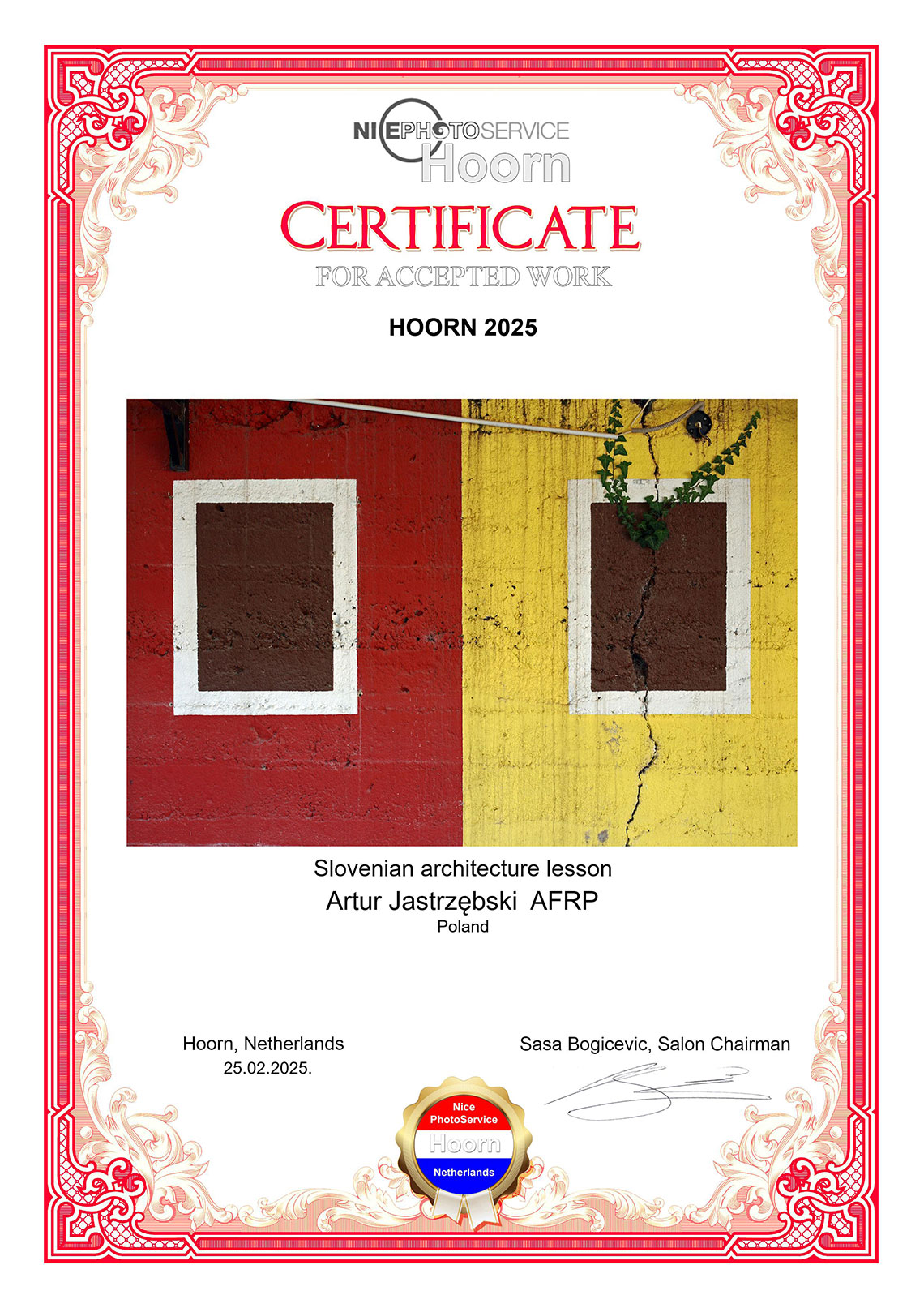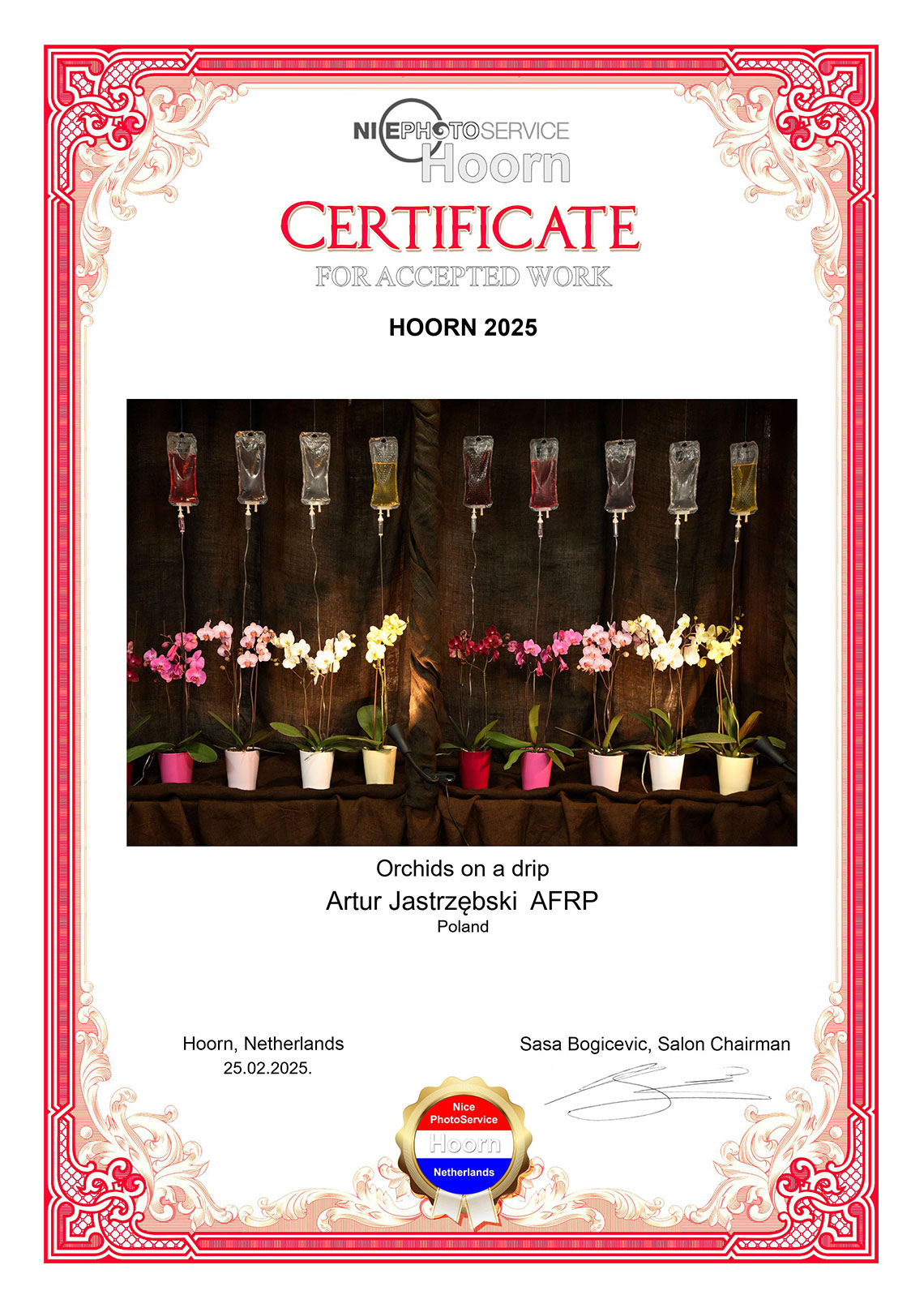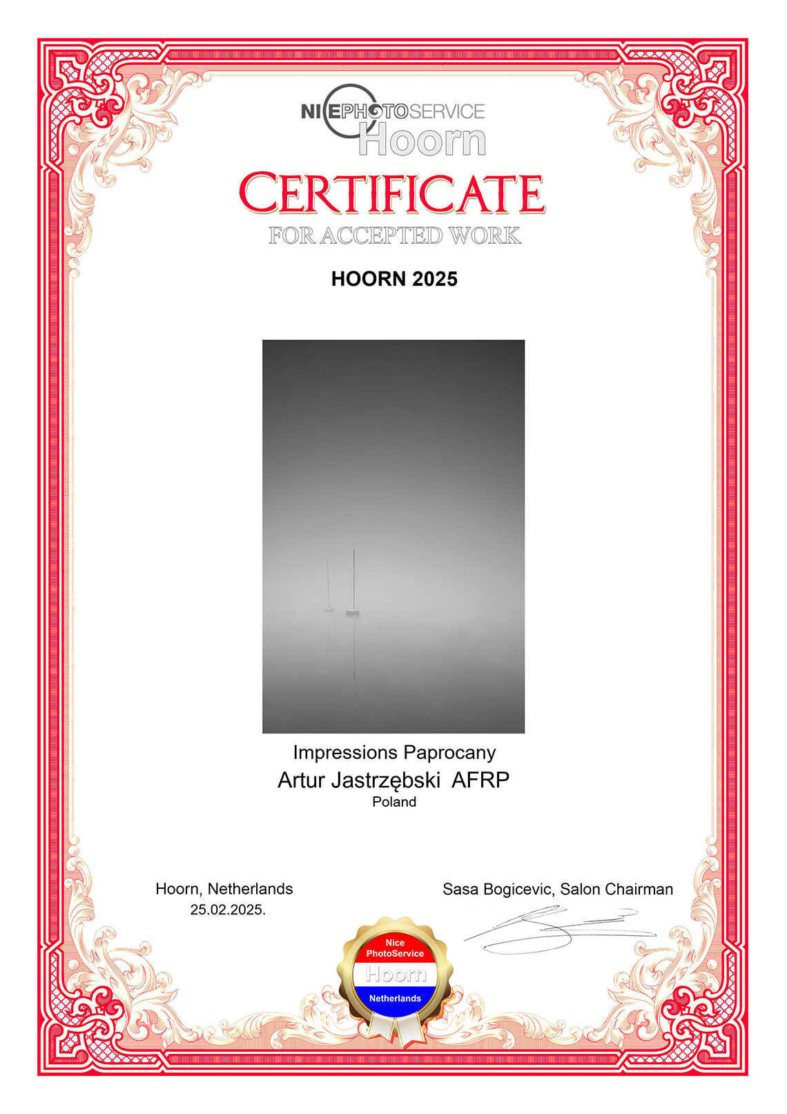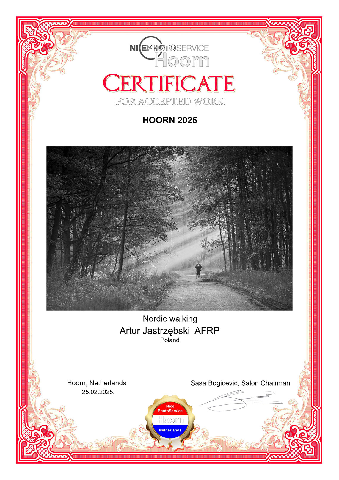 Zdjęcie z cyklu „Impresje paprocańskie” oraz „Nordic walking”, „Orchidee pod kroplówką” i „Słoweńska lekcja architektury” otrzymały „akceptację” w międzynarodowym konkursie fotograficznym „HOORN 2025” organizowanym przez holenderski Nice PhotoService Hoorn.