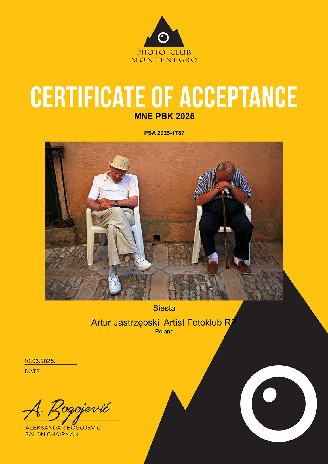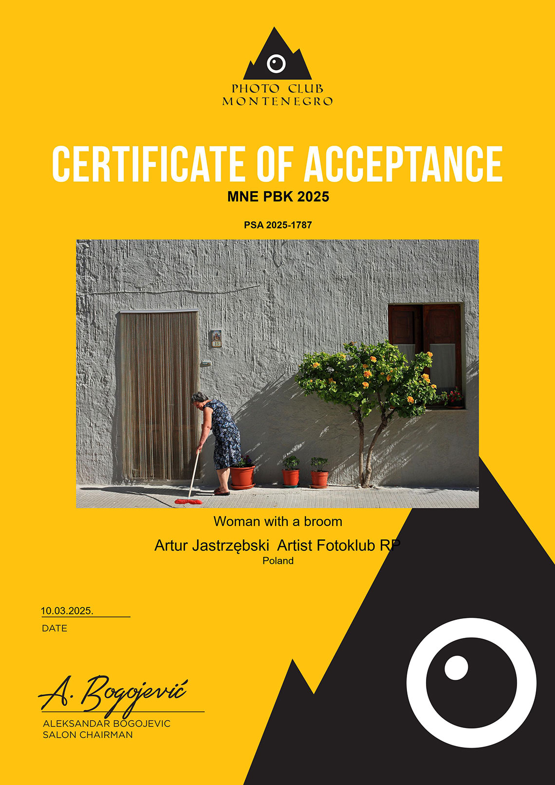 Zdjęcia z cyklu „Cielmice wieś wyjątkowa” i „Sycylijczycy” („Kobieta z miotłą”, „Sjesta”) oraz „Nordic walking” otrzymały „akceptacje” w międzynarodowym konkursie fotograficznym „MNE PBK 2025” organizowanym przez czarnogórski Photo club Montenegro.
