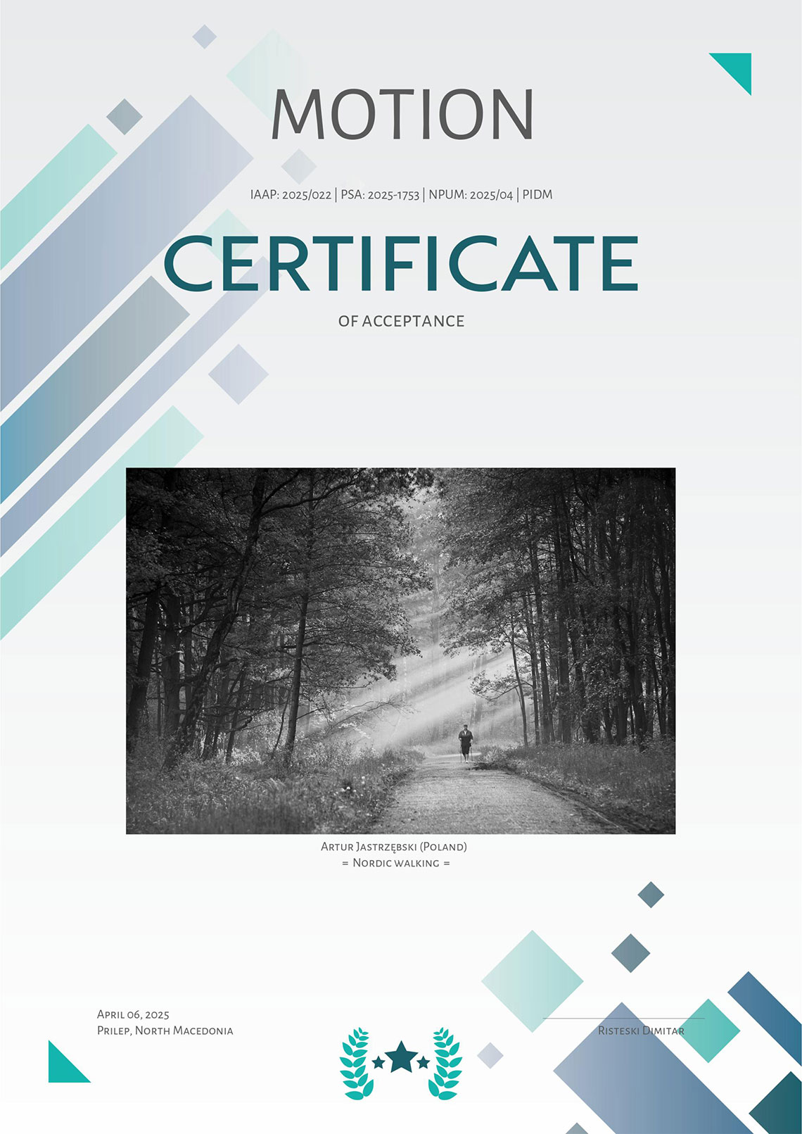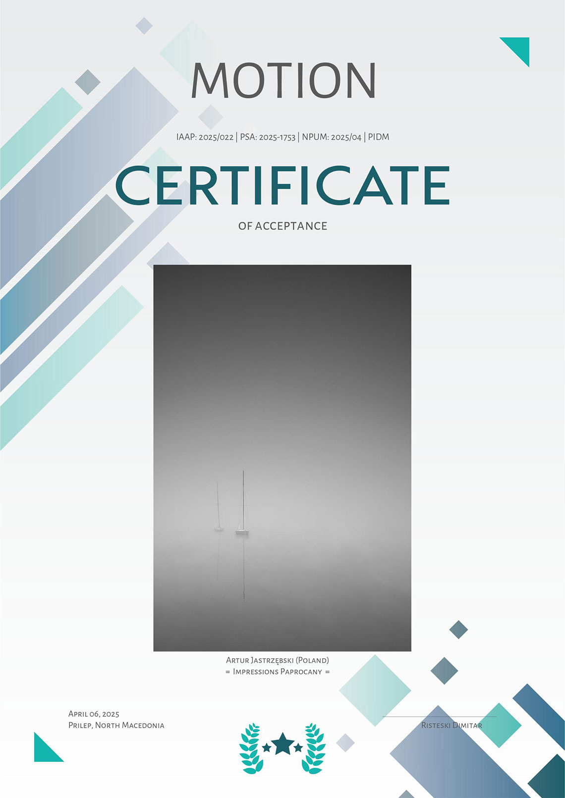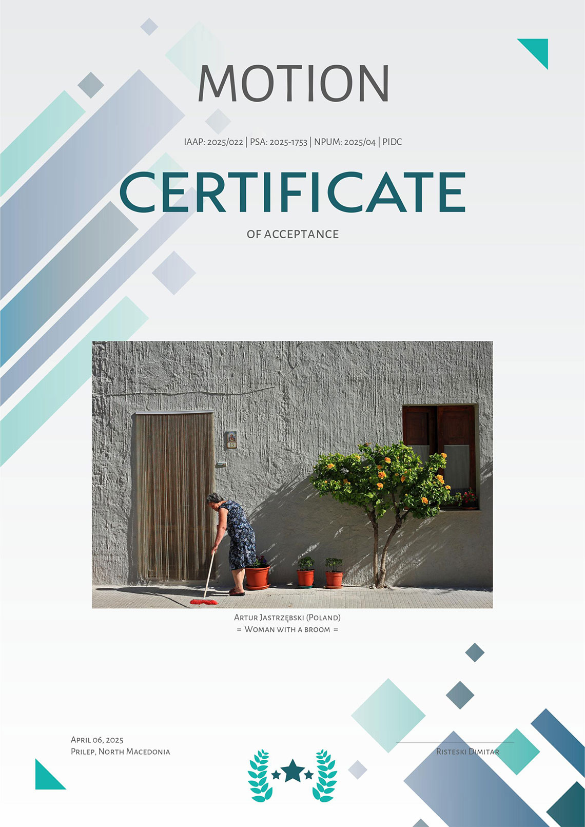 Zdjęcia z cyklu „Impresje paprocańskie” i „Sycylijczycy” („Kobieta z miotłą”) oraz „Nordic walking” otrzymały „akceptacje” w międzynarodowym konkursie fotograficznym Motion organizowanym przez północnomacedoński Photo Art Group Prilep.