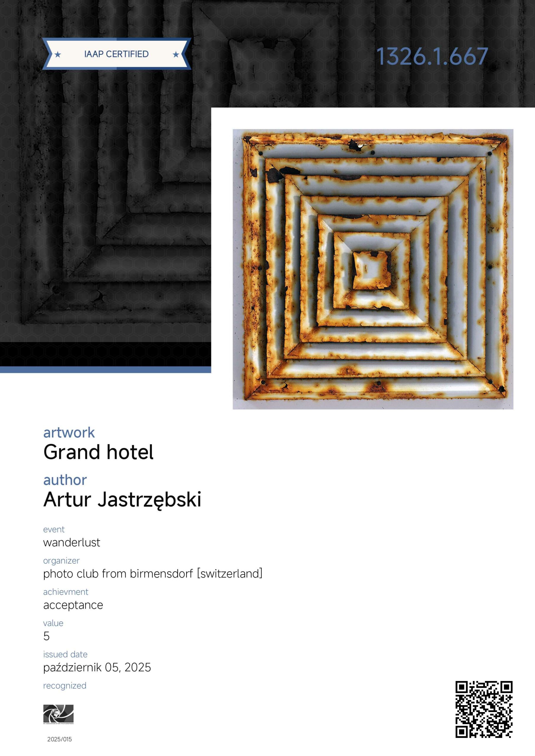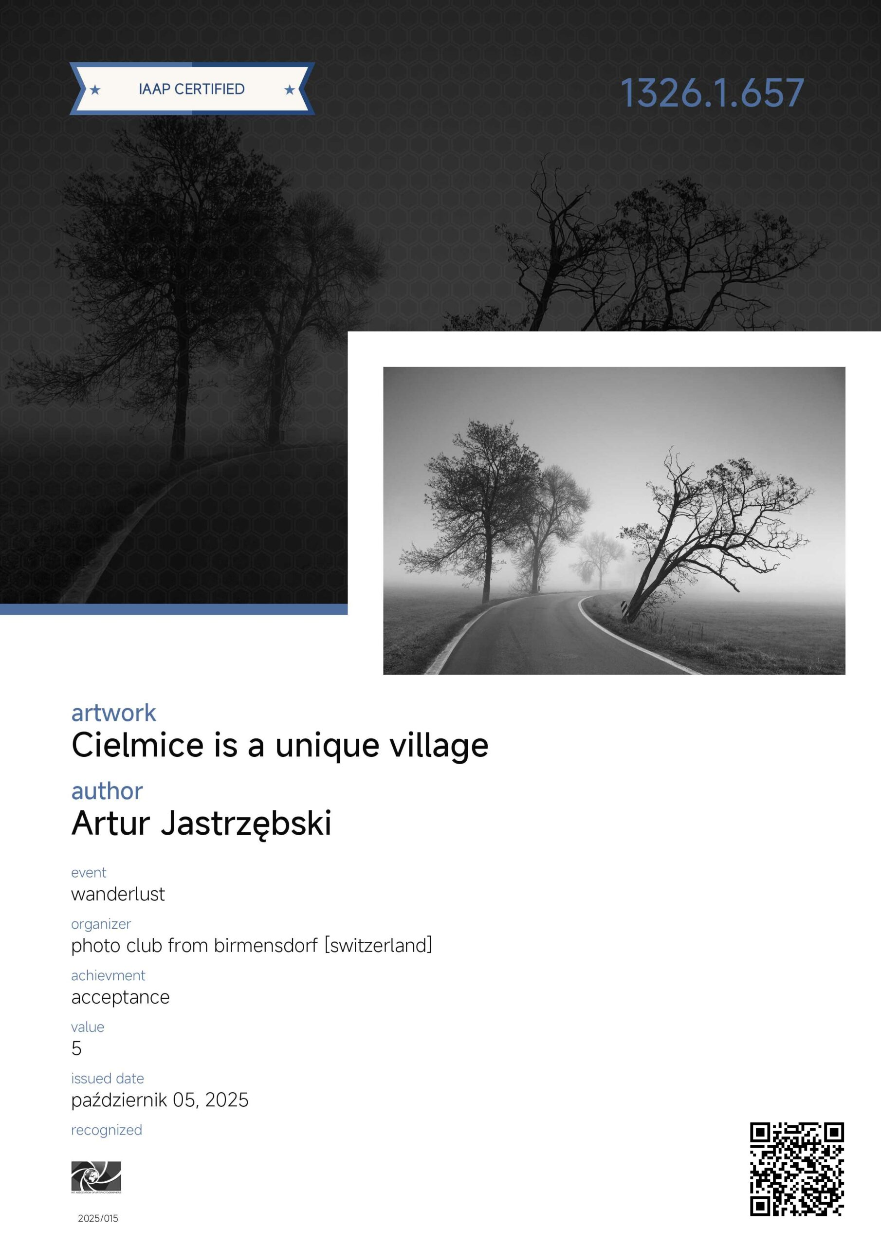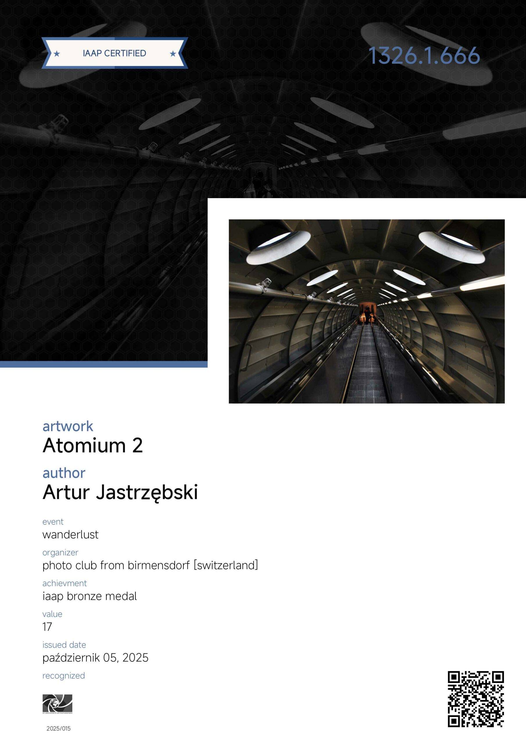 Zdjęcie „Atomium” otrzymało nagrodę (IAAP Bronze Medal) w kategorii SYMETRY. Ponadto fotografie z serii „Cielmice wieś wyjątkowa”, „Grand Hotel”, „Impresje paprocańskie” i „Słoweńska lekcja architektury” osiągnęły „akceptacje” w międzynarodowym konkursie fotograficznym WANDERLUST organizowanym przez szwajcarski Birmenstorfer Fotoclub.