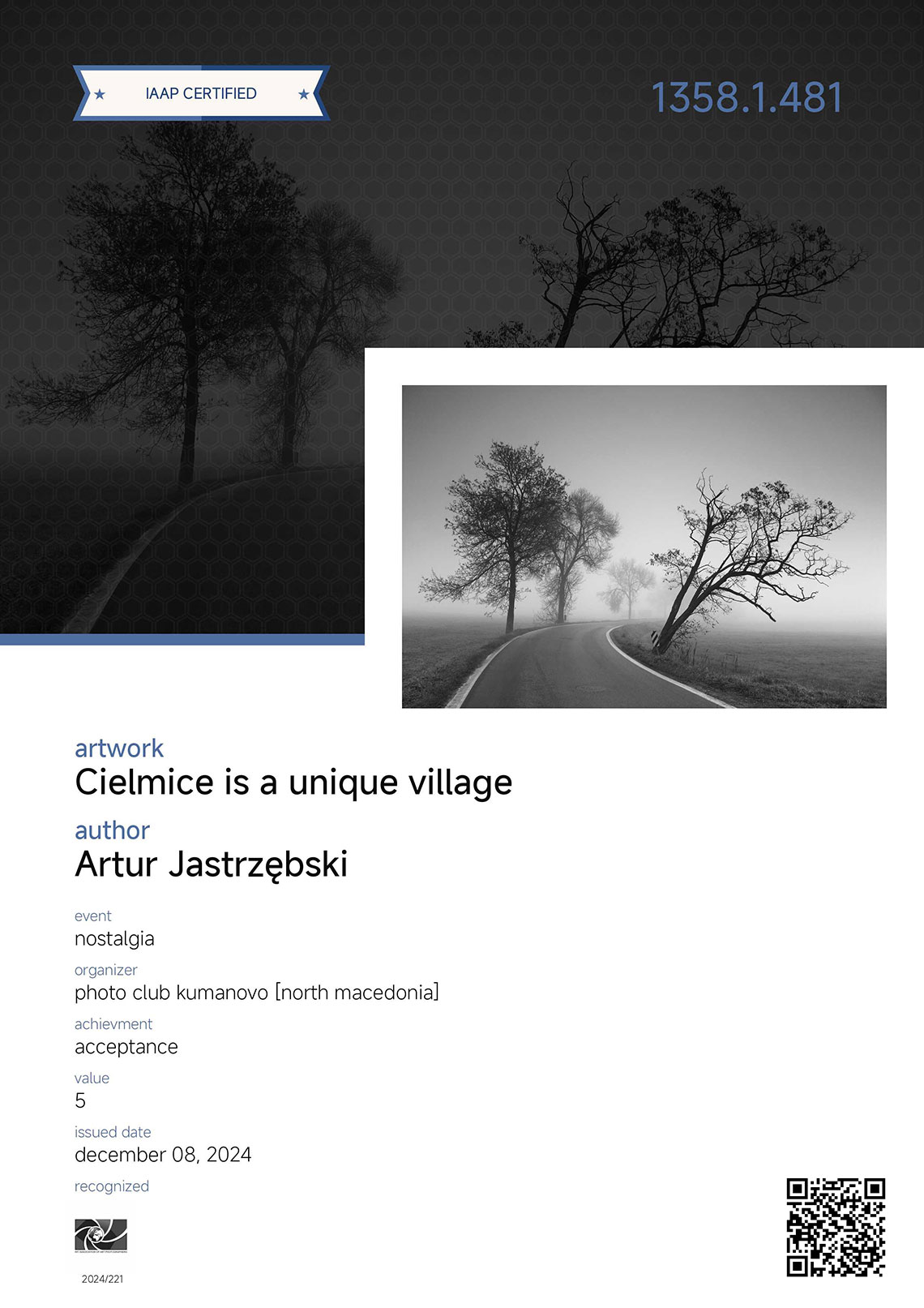 Zdjęcia z cyklu „Cielmice wieś wyjątkowa” i „Impresje paprocańskie” otrzymały „akceptację” w międzynarodowym konkursie fotograficznym Nostalgia organizowanym przez północnomacedoński Photo club Kumanovo.