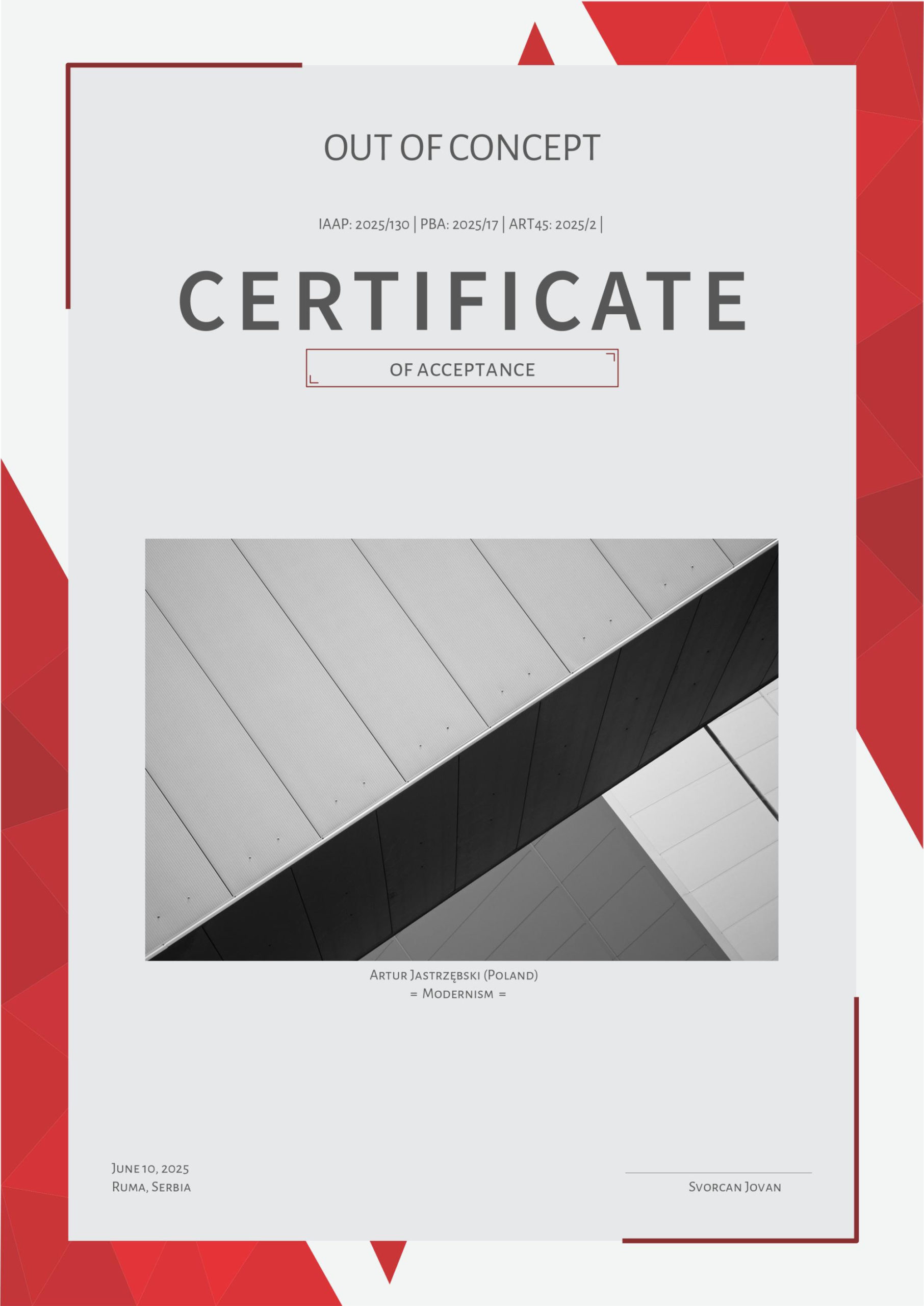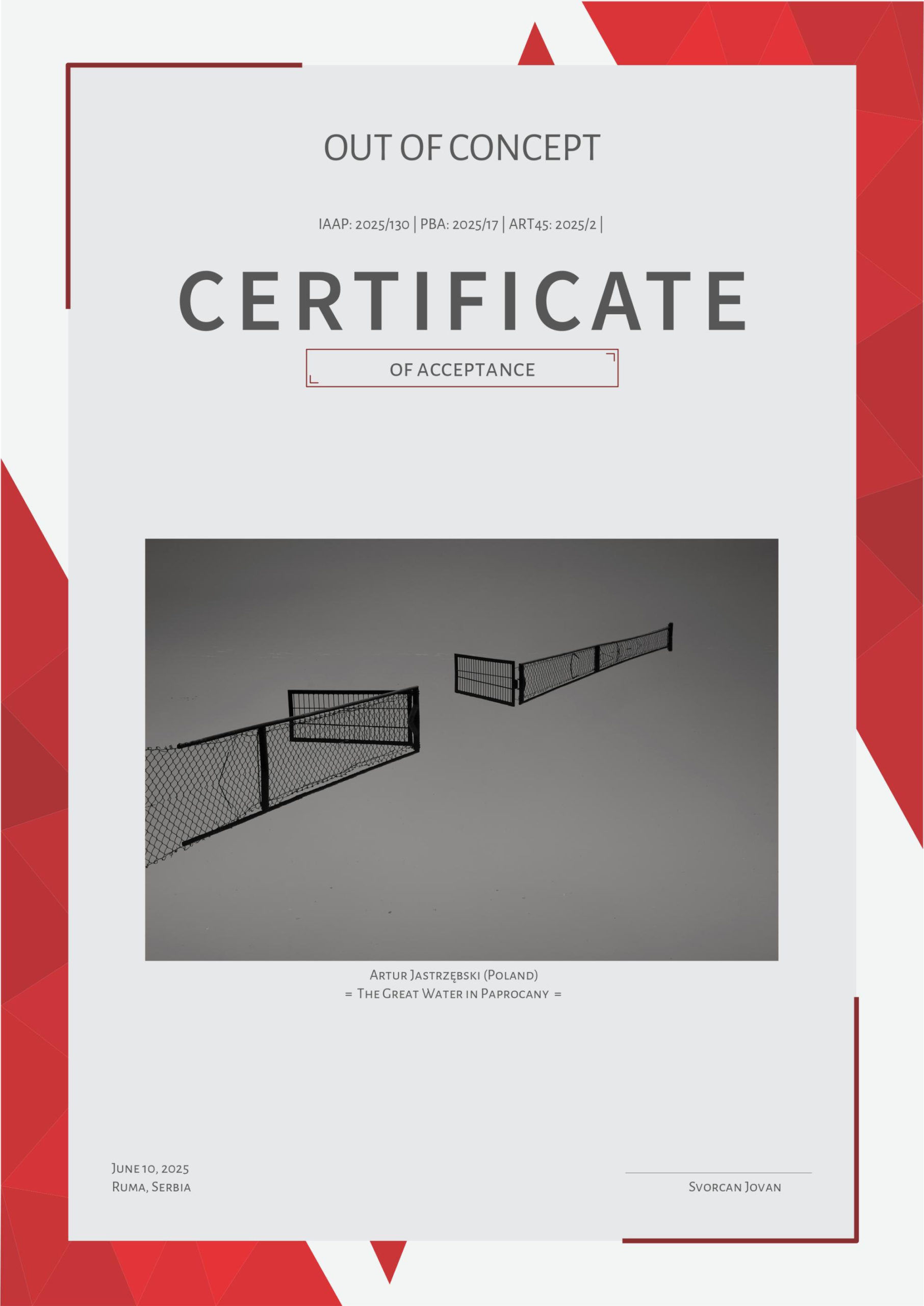 Zdjęcia z cyklu „Sinice” i „Wielka woda w Paprocanach” oraz „Modernizm” otrzymały „akceptacje” w międzynarodowym konkursie fotograficznym OUT OF CONCEPT organizowanym przez serbski PG OUT OF CONCEPT.