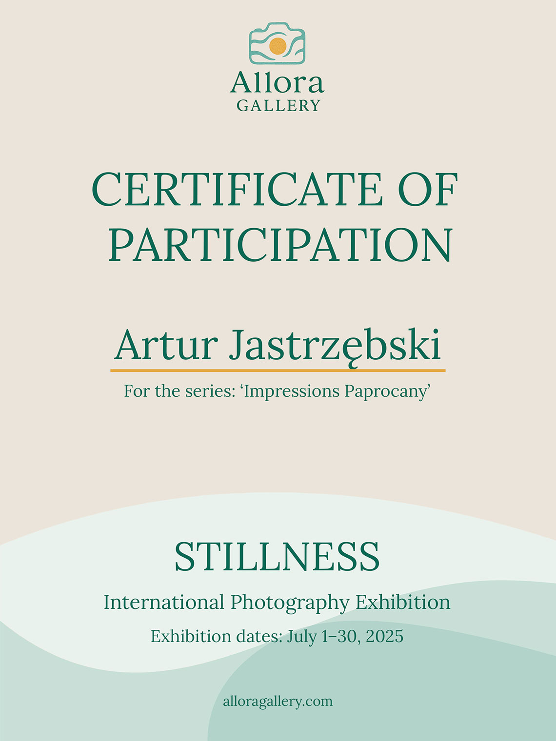 Zdjęcia z cyklu „Impresje paprocańskie” zostały zakwalifikowane do międzynarodowej internetowej wystawy zbiorowej STILLNESS. Ekspozycja prezentowana będzie w terminie 01-31.07.2025 w Allora GALLERY w Czarnogórze. Kuratorem przedsięwzięcia jest Oksana Bochina.