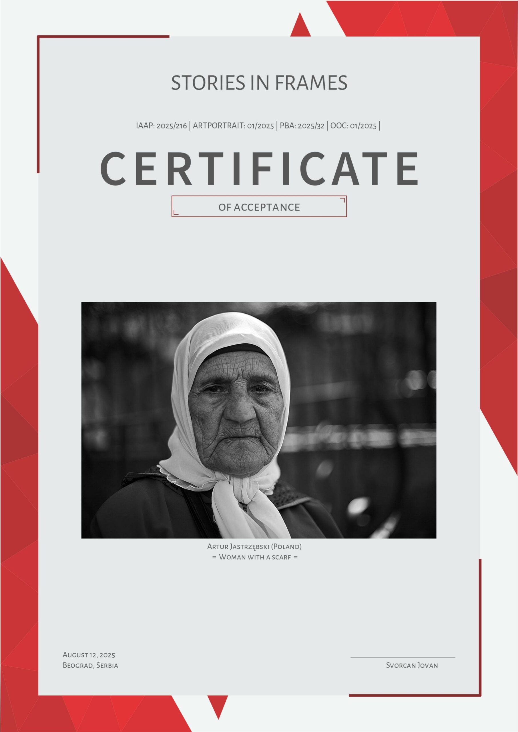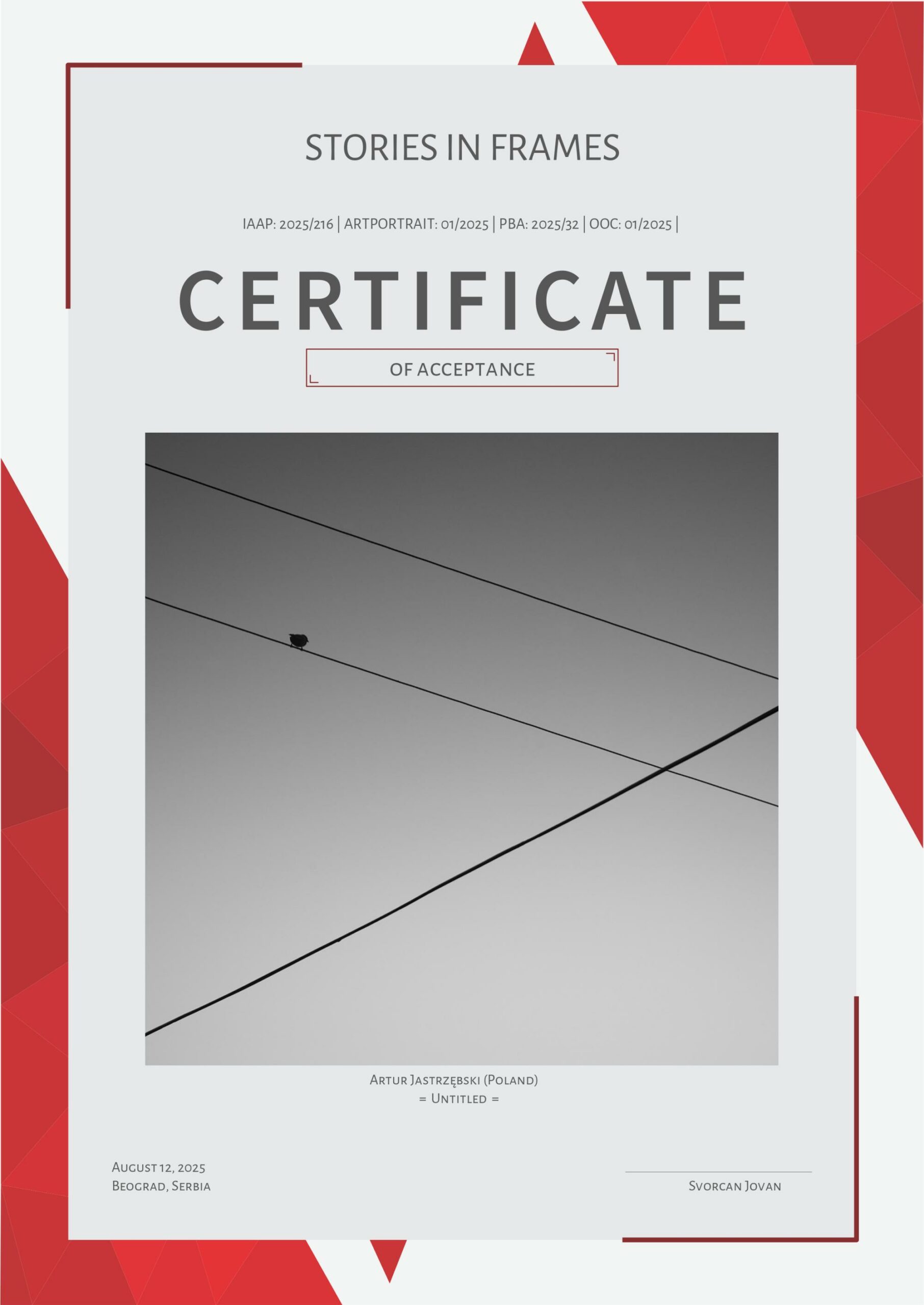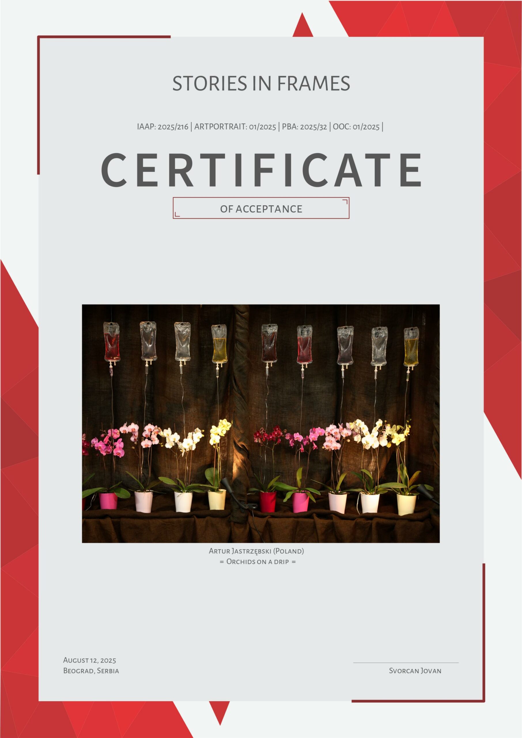 Zdjęcia z cyklu „Impresje paprocańskie” oraz „Bez tytułu”, „Kobieta z chustą” i „Orchidee pod kroplówką” otrzymały „akceptacje” w międzynarodowym konkursie fotograficznym STORIES IN FRAMES 2025 organizowanym przez serbski PG OUT OF CONCEPT.