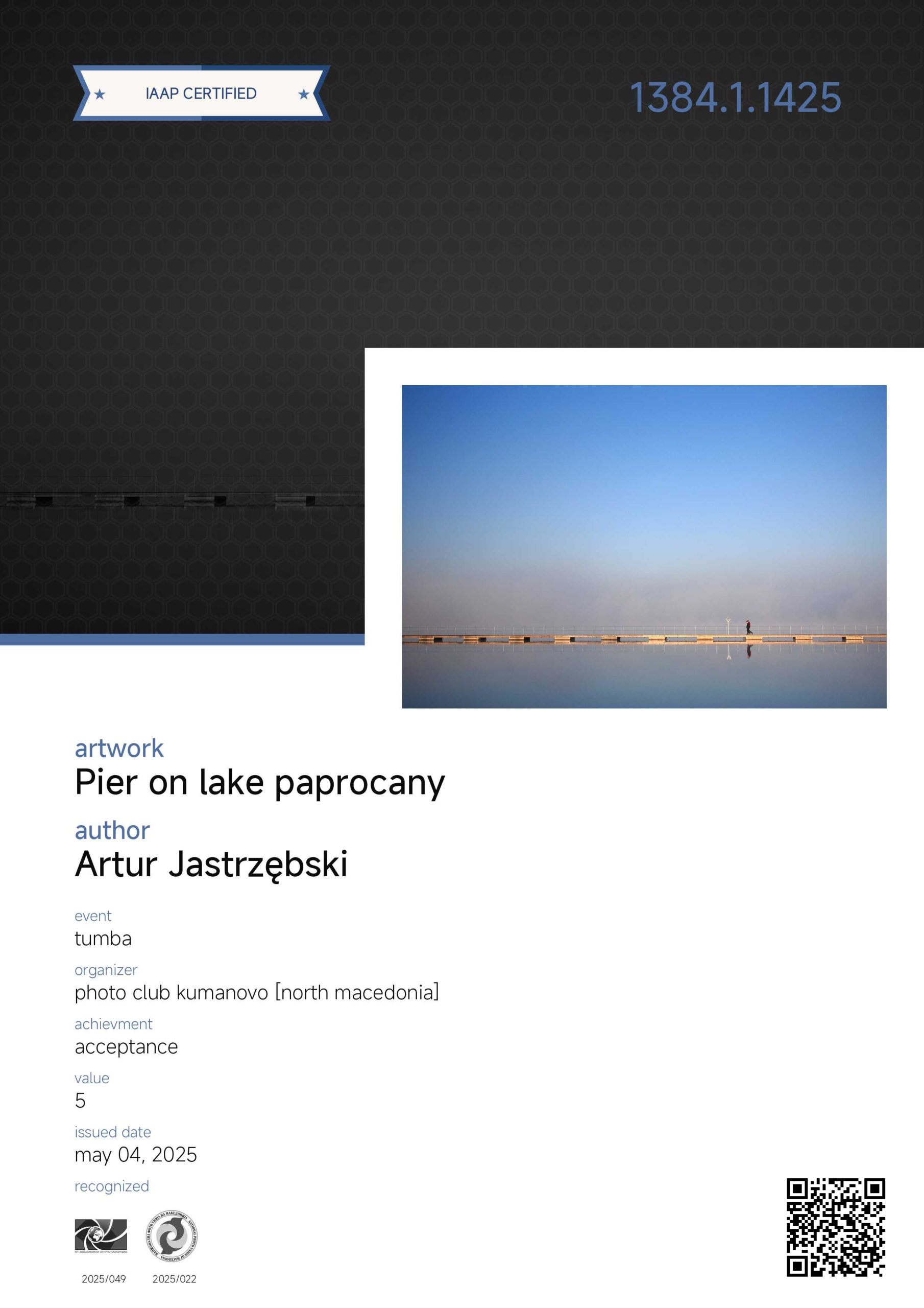 Zdjęcie z cyklu „Impresje paprocańskie” i „Pomost na Jeziorze Paprocańskim” otrzymały „akceptacje” w międzynarodowym konkursie fotograficznym tumba organizowanym przez północnomacedoński Photo club Kumanovo.