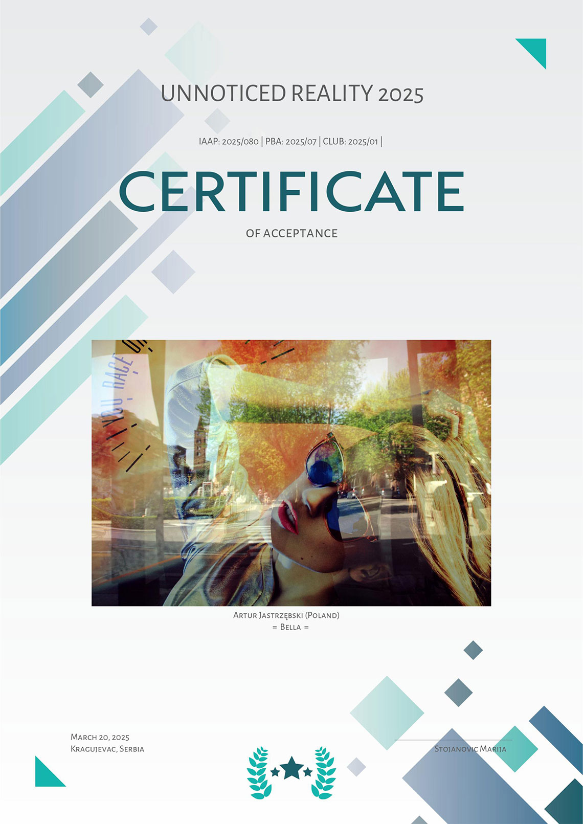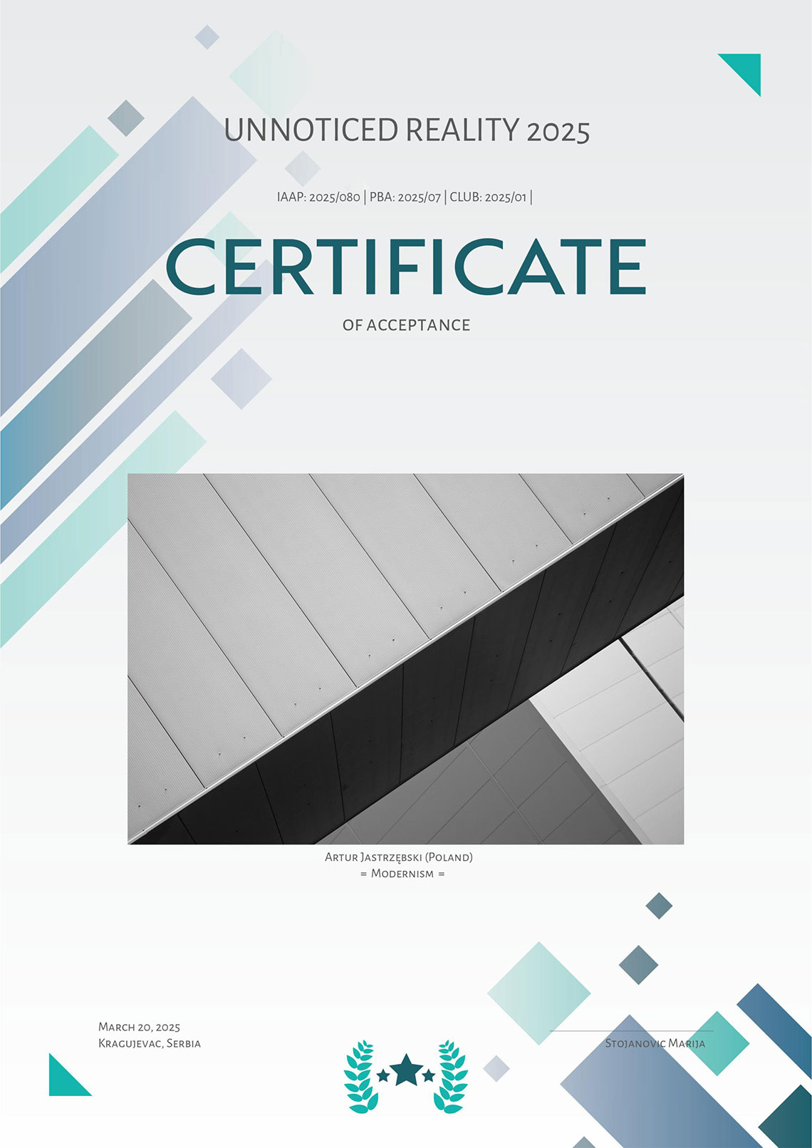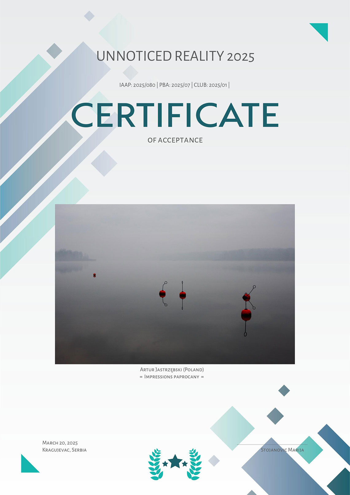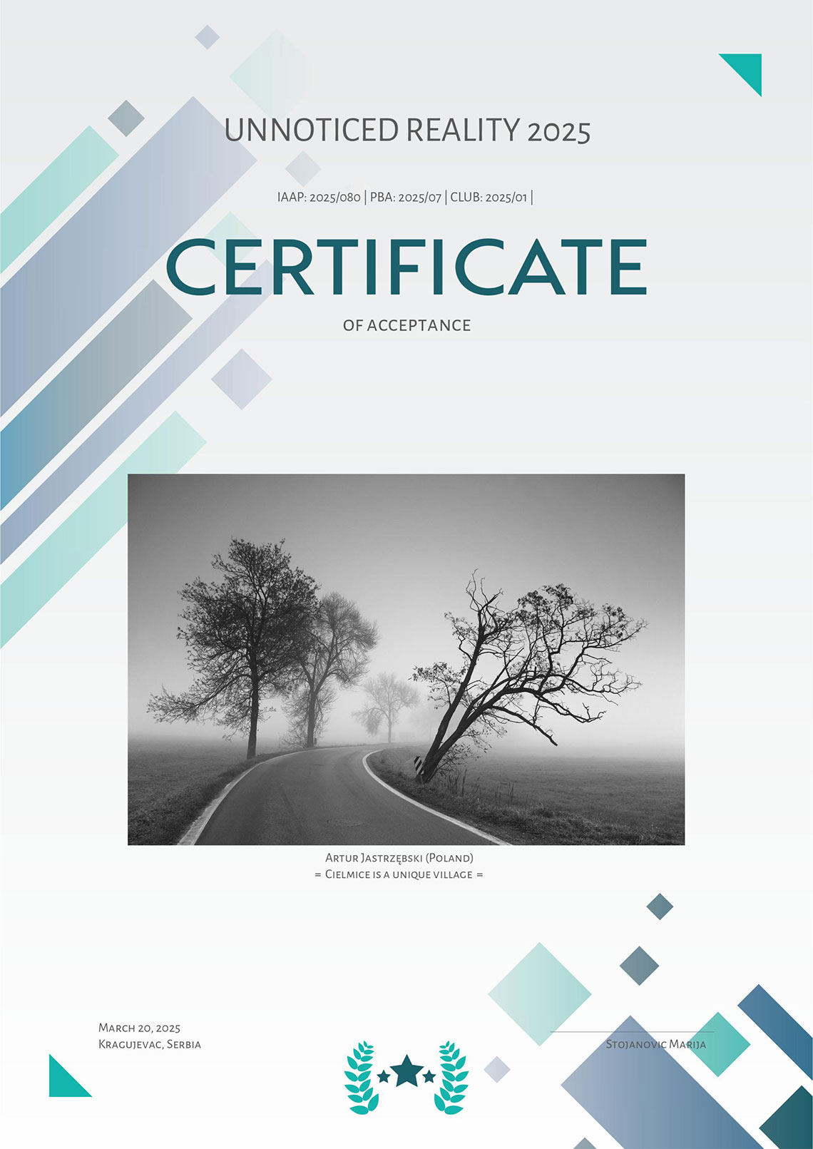 Zdjęcia z cyklu „Cielmice wieś wyjątkowa” i „Impresje paprocańskie” oraz „Bella”, „Modernizm” i „Słoweńska lekcja architektury” otrzymały „akceptację” w międzynarodowym konkursie fotograficznym UNNOTICED REALITY 2025 organizowanym przez serbski Global Art.