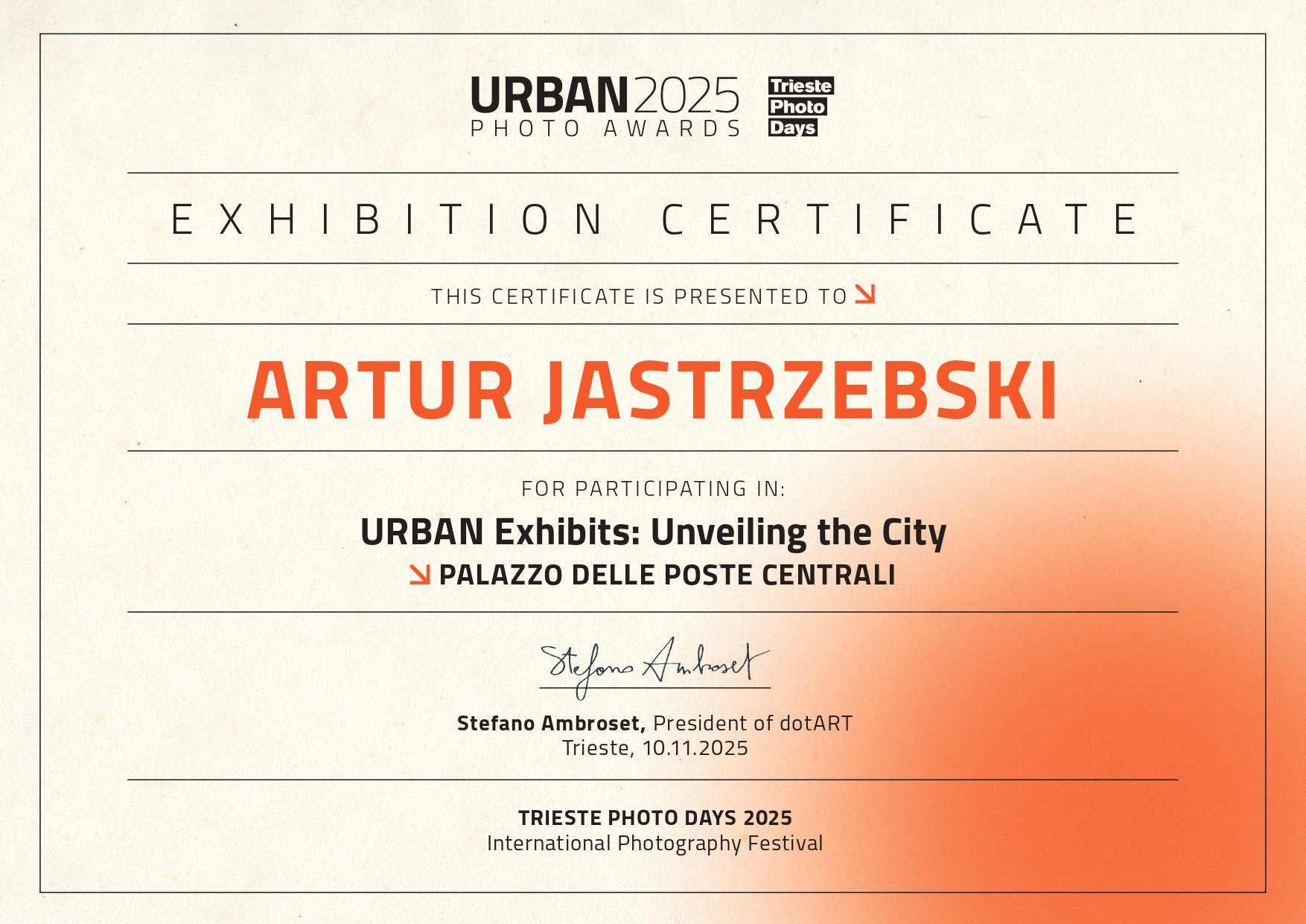 Zdjęcie z cyklu „Sinice” zostało zakwalifikowane do międzynarodowej wystawy zbiorowej URBAN Photo Awards 2025 – Unveils the City and its Secrets. Ekspozycja, w ramach festiwalu Trieste Photo Days, prezentowana będzie w terminie 13.10-29.11.2025 w Pałacu Poczty Centralnej we włoskim Trieście. Organizatorem przedsięwzięcia jest Stowarzyszenie Promocji Społecznej Exhibit Around APS.