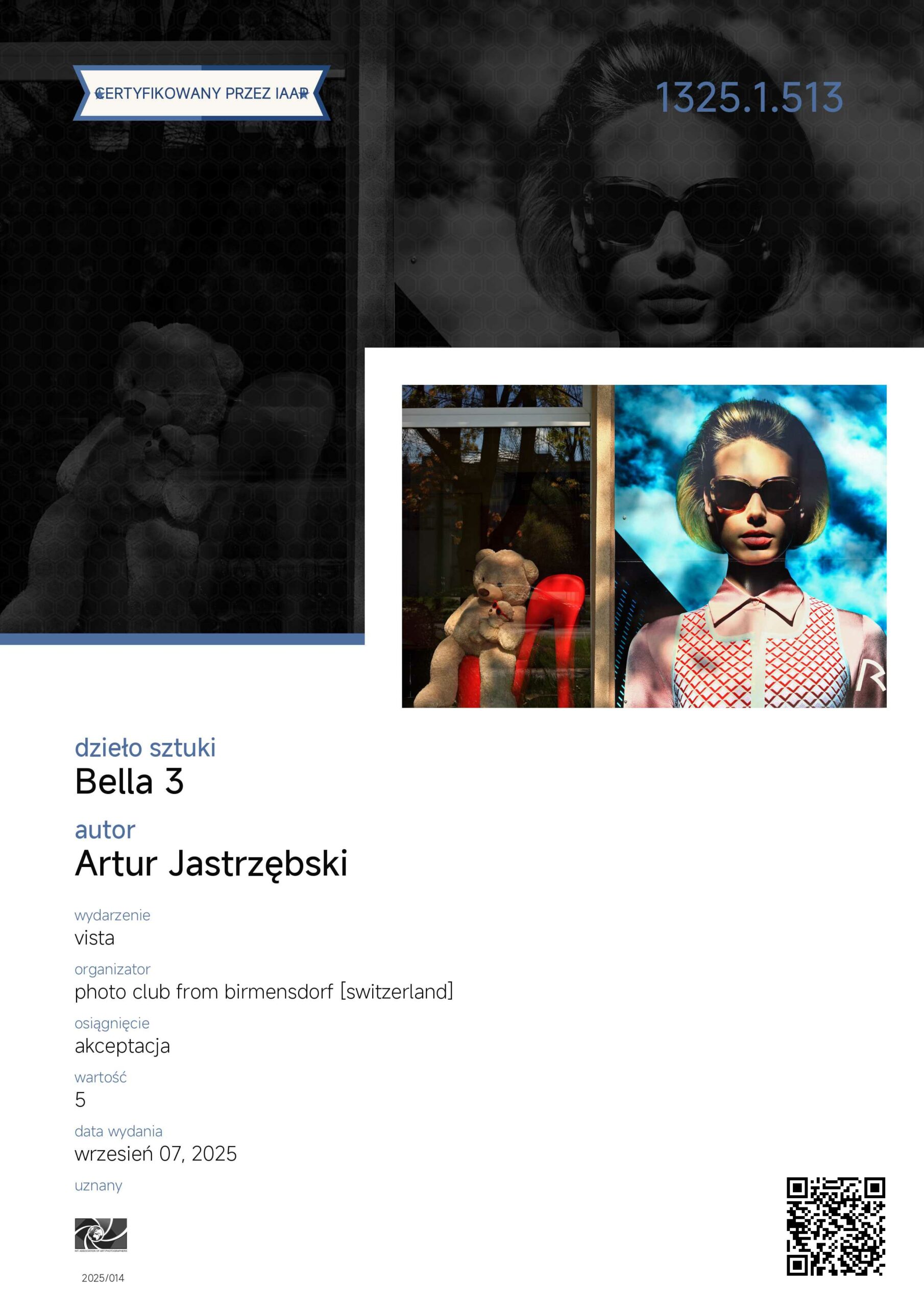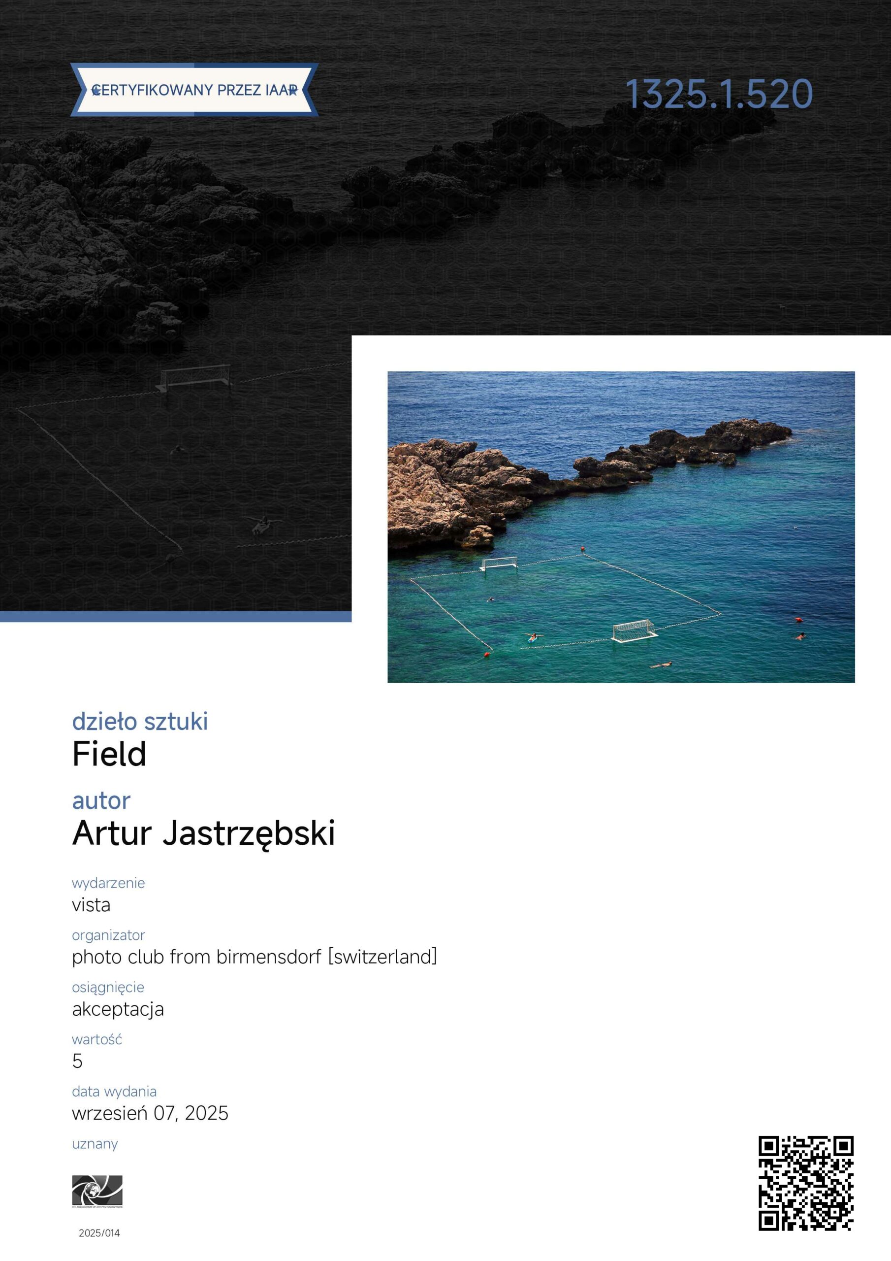 Zdjęcie z cyklu „Sinice” oraz „Bella 3”, „Boisko” i „Pomost na Jeziorze Paprocańskim” otrzymały „akceptacje” w międzynarodowym konkursie fotograficznym Vista organizowanym przez szwajcarski photo club from Birmensdorf.