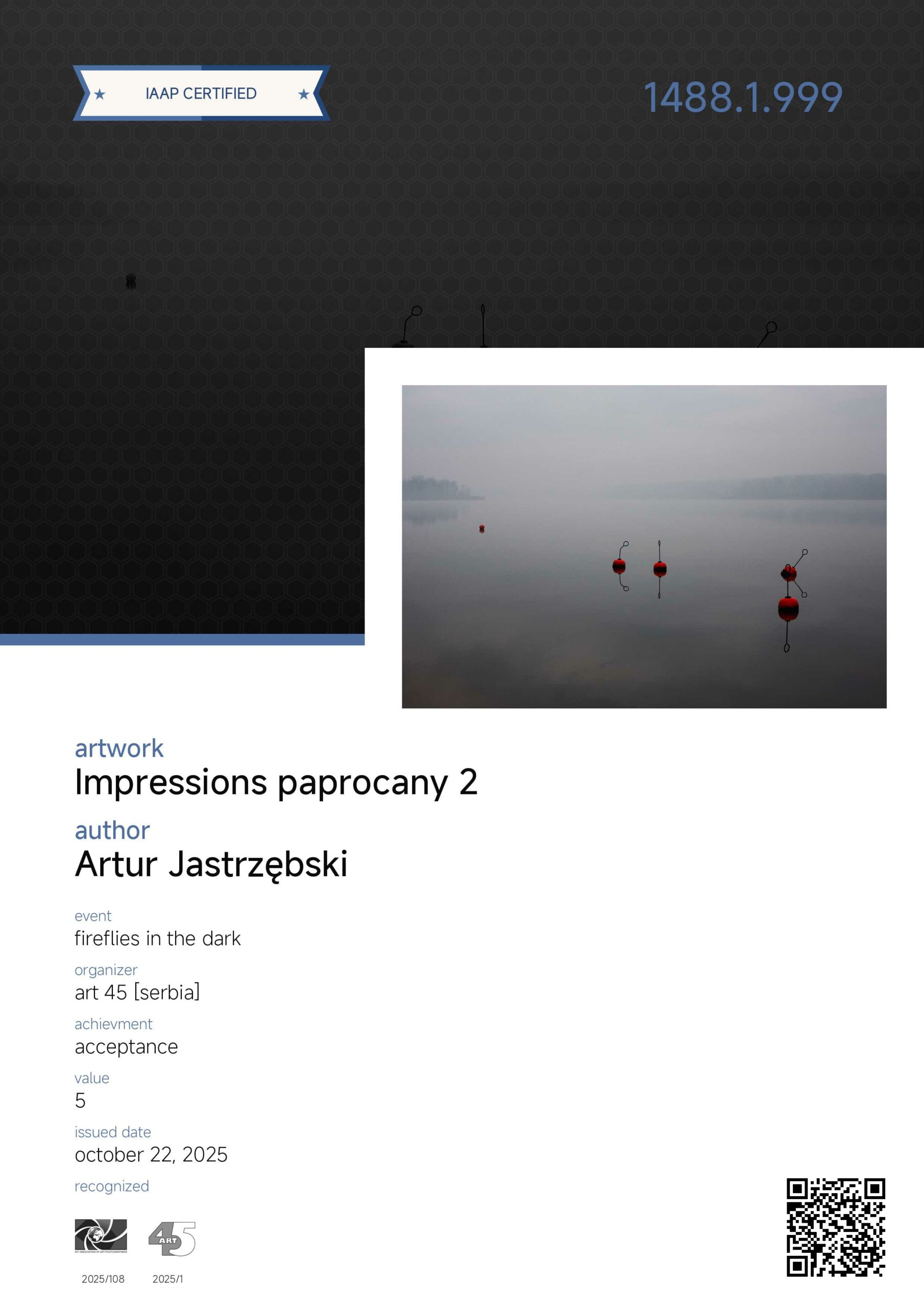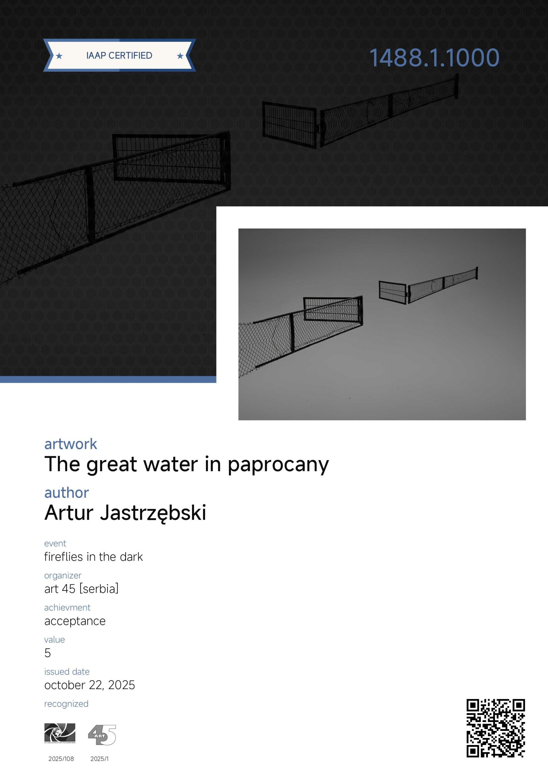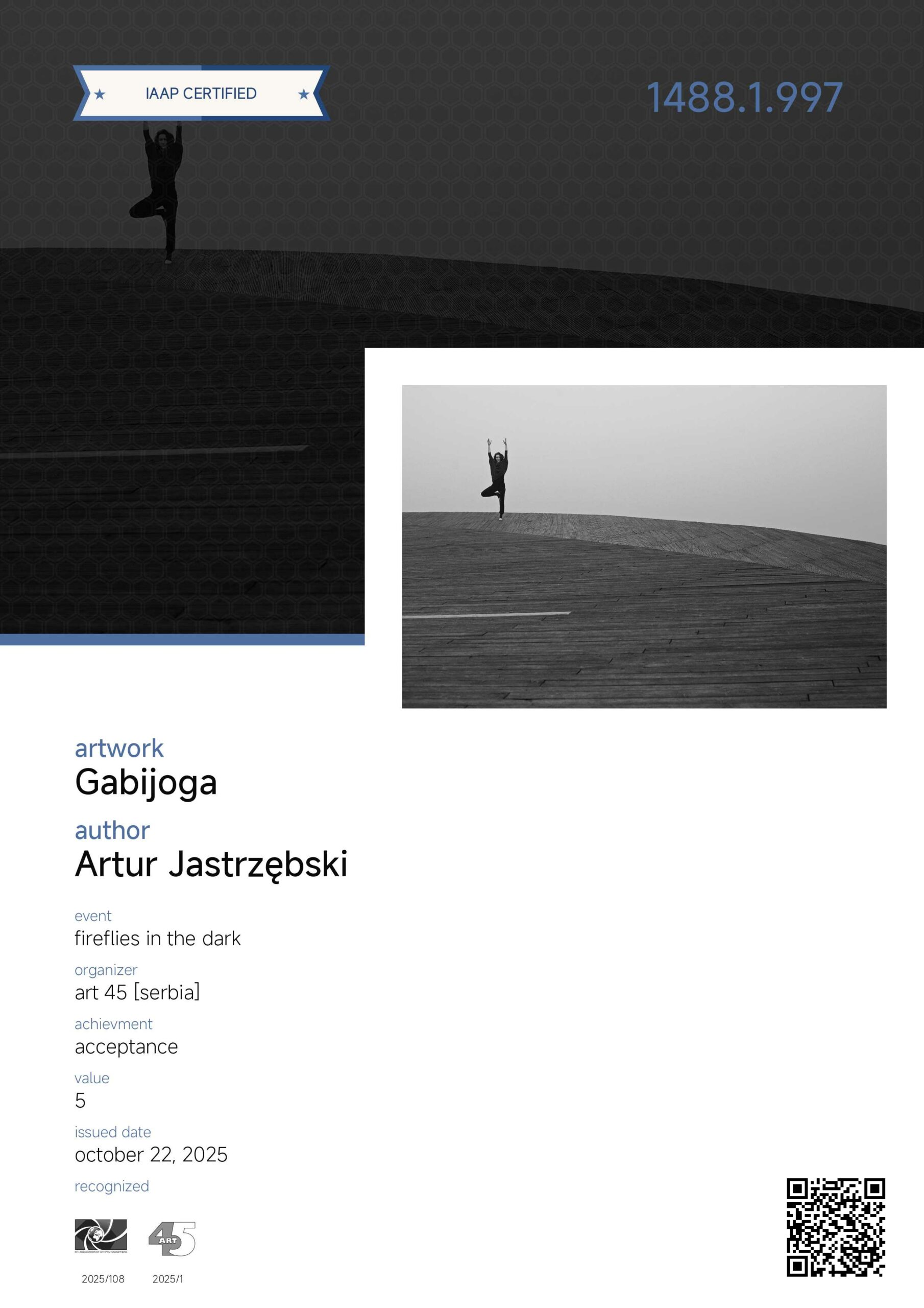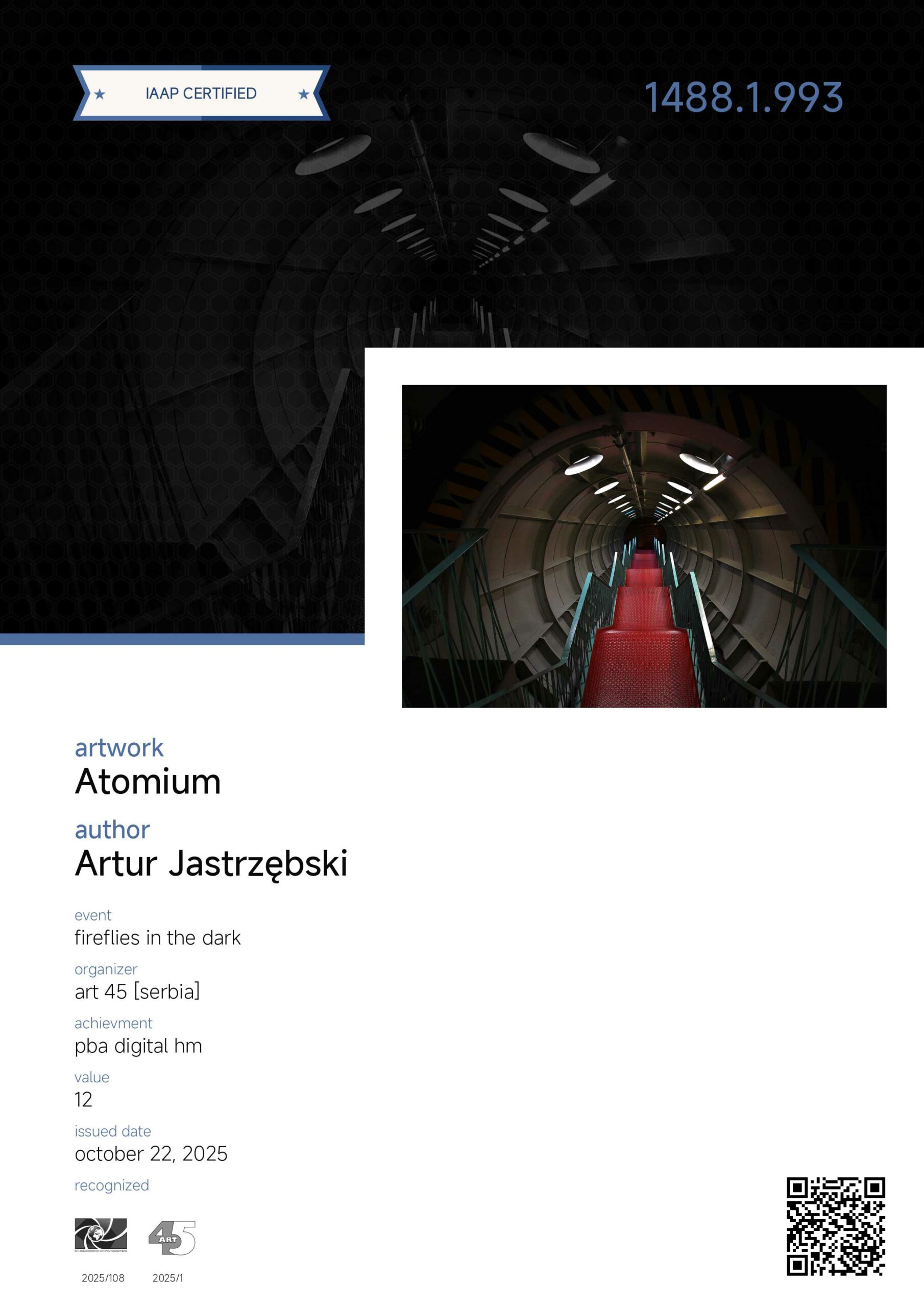 Zdjęcie „Atomium” otrzymało wyróżnienia honorowe (PBA Digital HM) w kategorii ARCHITECTURE. Ponadto fotografie z cyklu „GabiJoga”, „Impresje paprocańskie” i „Wielka woda w Paprocanach” osiągnęły „akceptacje” w międzynarodowym konkursie fotograficznym FIREFLIES IN THE DARK organizowanym przez serbski Foto club ART45.