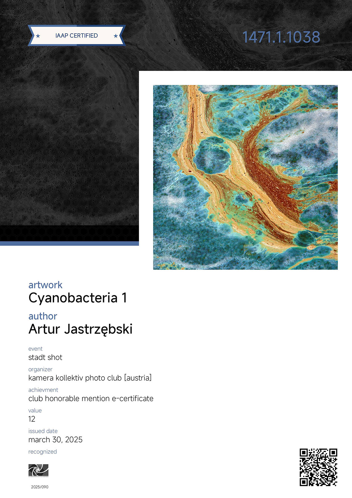 Zdjęcie z cyklu „Sinice” otrzymało wyróżnienie honorowe (CLUB Honorable mention E-Certificate) w kategorii NATURE w międzynarodowym konkursie fotograficznym Stadt Shot organizowanym przez austriacki Kamera Kollektiv Photo Club.