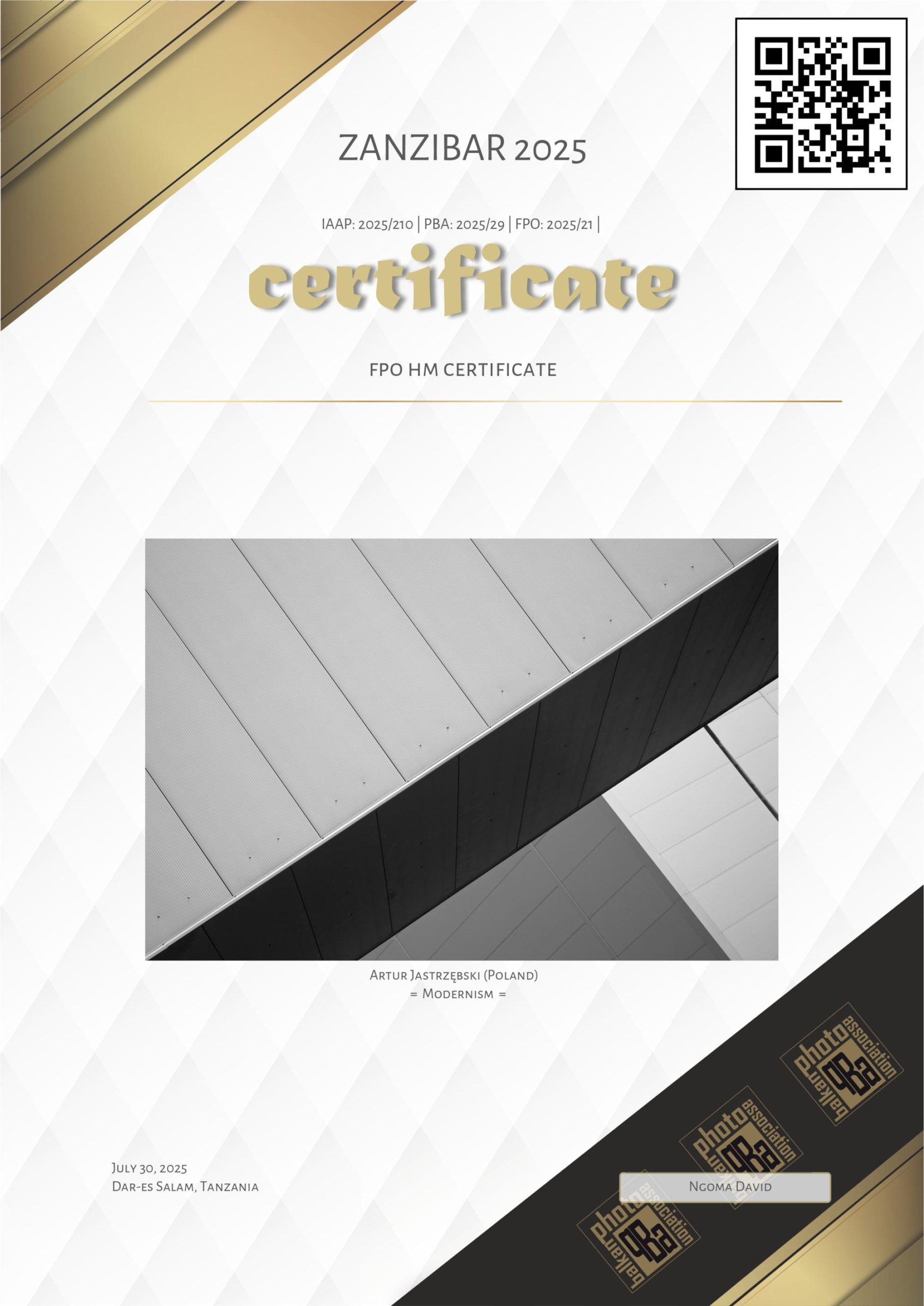 Zdjęcie „Modernizm” otrzymało wyróżnienie honorowe (FPO HM Certificate) w kategorii lines w międzynarodowym konkursie fotograficznym Zanzibar Photo 2025 organizowanym przez tanzański Safari Shutter Club.