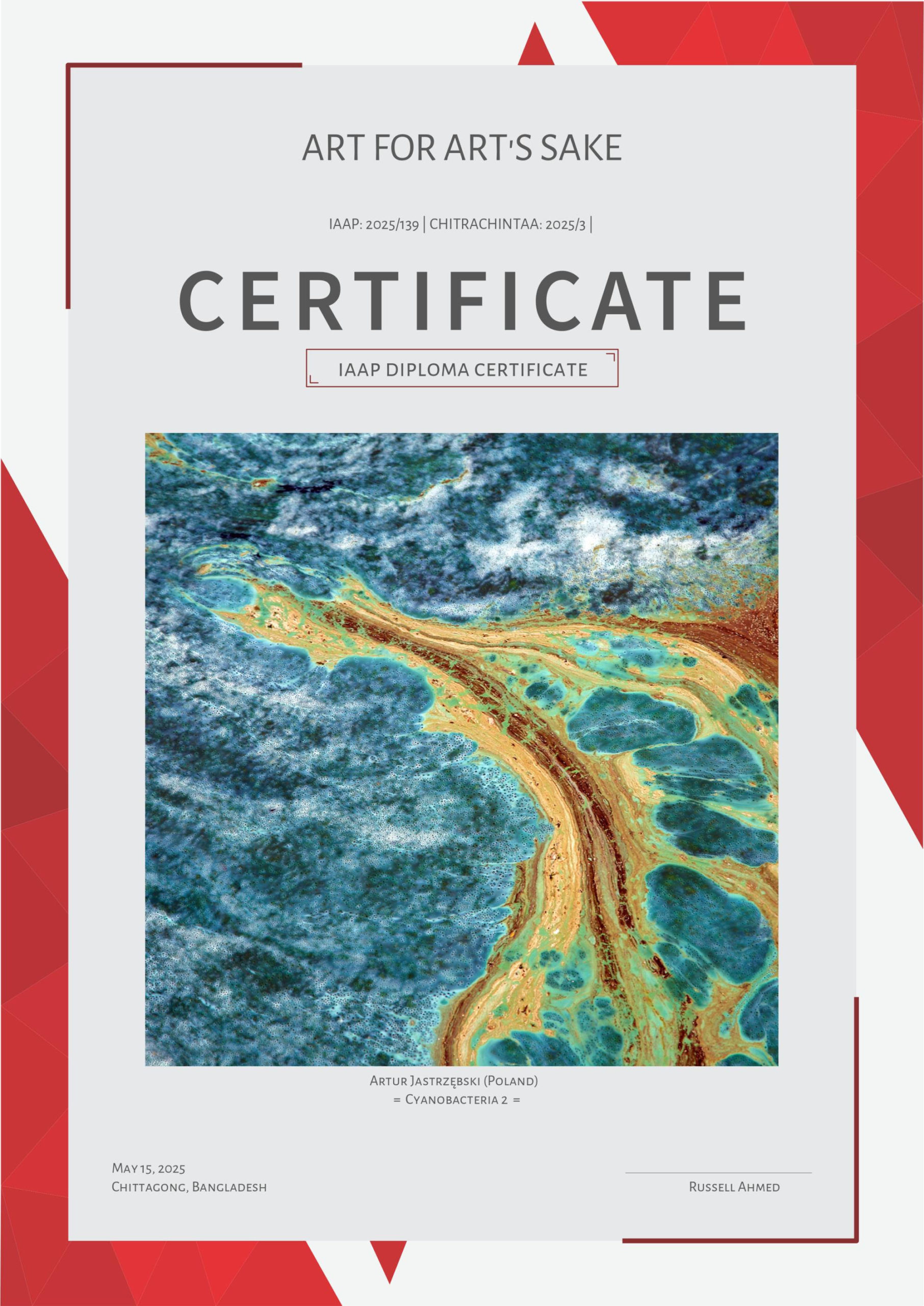 Zdjęcie z cyklu „Sinice” otrzymało wyróżnienie (IAAP DIPLOMA CERTIFICATE) w kategorii Abstract w międzynarodowym konkursie fotograficznym ART FOR ART’S SAKE organizowanym przez bangladeski CHITRACHINTAA PHOTOGRAPHERS CIRCLE.